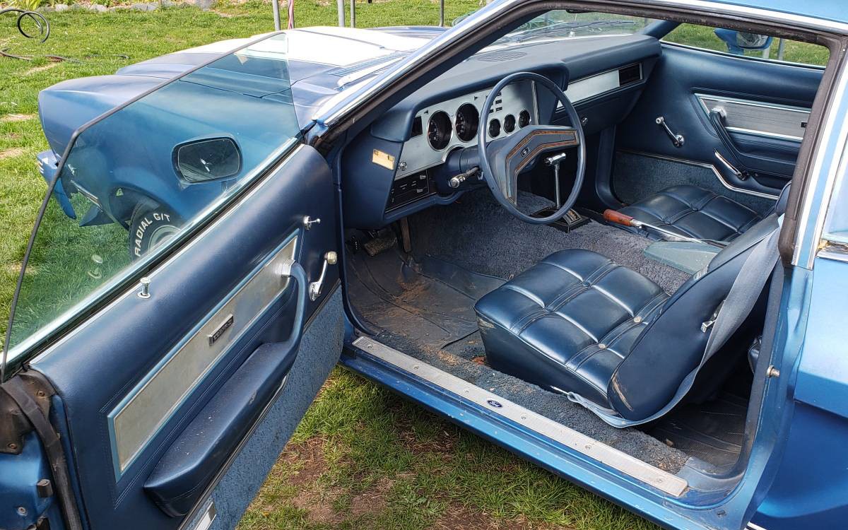 The scuff plate on the drivers side isn’t original to the car. Ford didn’t incorporate the blue oval on their vehicles until 1982.