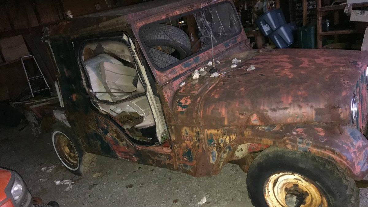 I’m guessing this is the picture of the arrival at the seller’s shop. Check out that functional front bumper! Actually, from this view the old Jeep doesn’t look too bad at all. I’m not saying this is the vehicle you want to restore to concours condition, but for riding trails with some patina, maybe it works for you?
