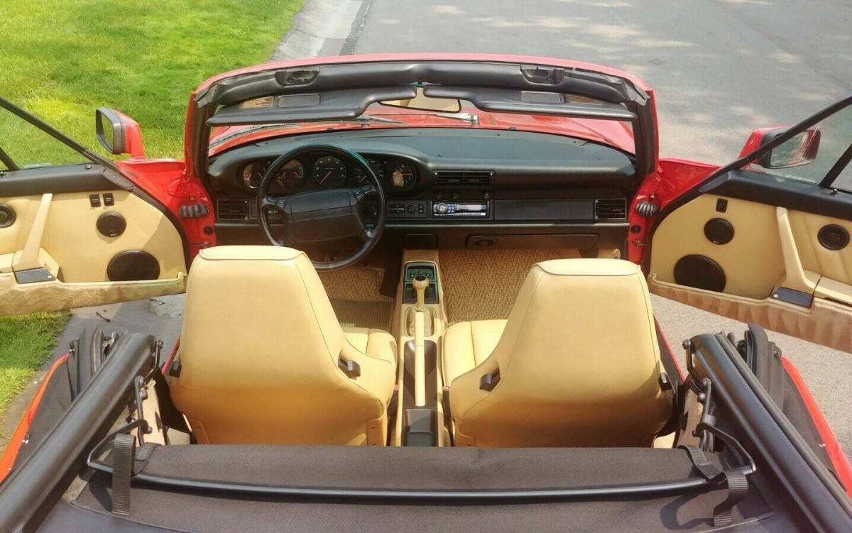 I’d also note that the top is either a poor quality selection or the installer lacking in the skills to install it correctly. Gaps under the rear and wrinkles detract from the car. Re-dyed seats? What will be the longevity of that? I also note either distinct fading or non factory(?) rear lights/Porsche reflector.