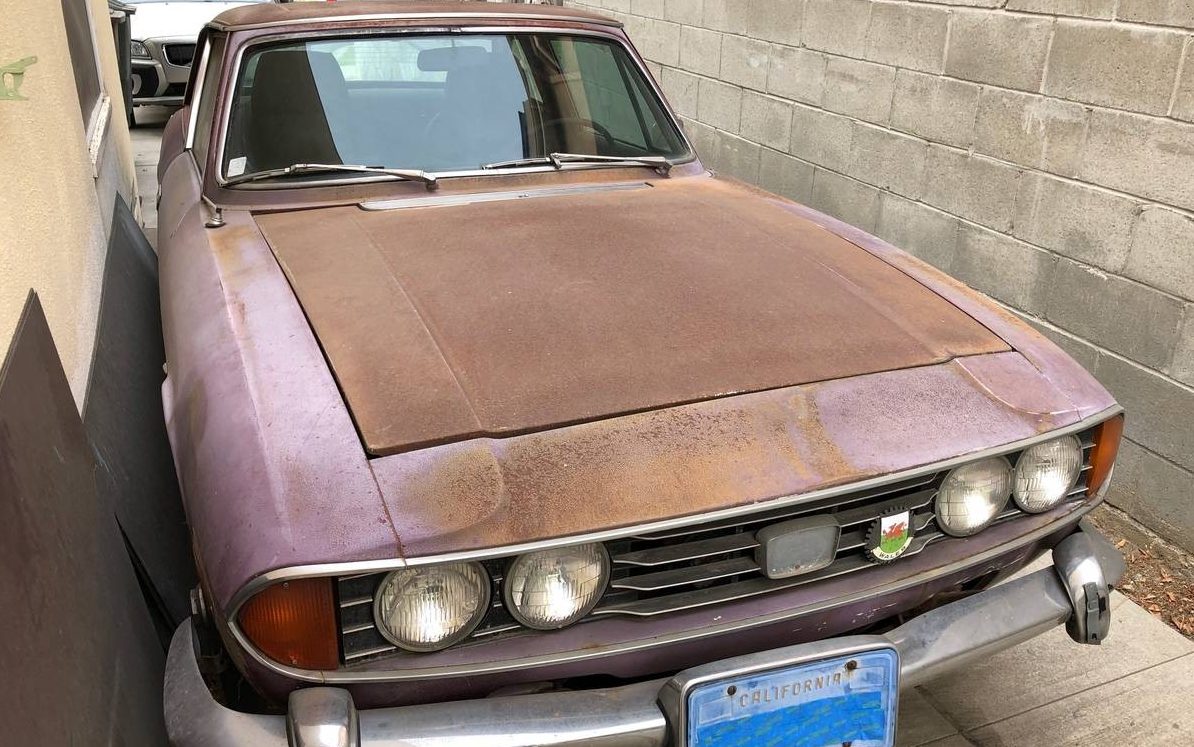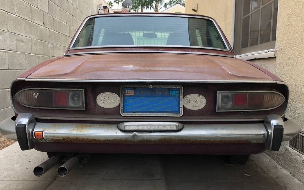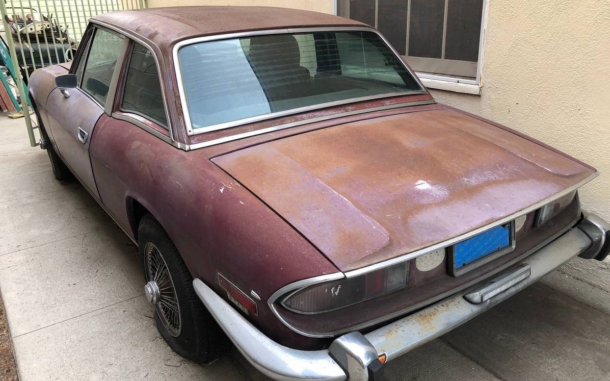 The seller of this Stag refers to it as a complete but not running car. It is sitting wedged into a narrow sort of alleyway so it’s difficult to get a comprehensive view but it does appear to be complete, straight, and not rotted out. The finish is pretty well burned off, probably from the southern California sun, and there is a light, real (not faux) patina to both the horizontal and vertical surfaces. It is (was?) an unusual color that is now hard to decipher, a sort of pinkish/purplish hue, it reminds me of a worn-out GM “Evening Orchid”. All of the trim appears to be present and the bumper chrome is fair to worn. But yes, overall, it appears to be a complete car. The seller states that the hardtop is, in fact, removable.