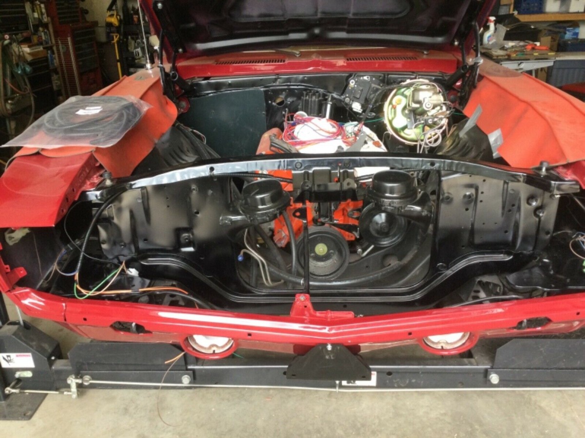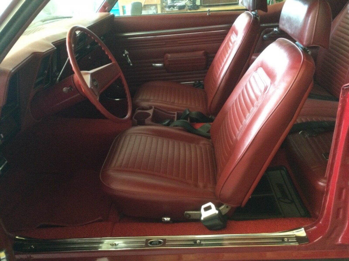 All the bodywork is said to have been done and the car sports a new coat of Garnet Red which was its original color. The Rally wheels have been painted black for a nice contrast. It will need a new front cowling and grill to be complete (bumper, too, we suppose), and that may take care of the exterior. The red interior is also all new and we’re told the only thing still needed is to install the headliner which will come with the car.