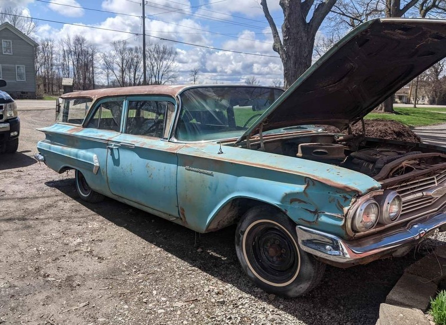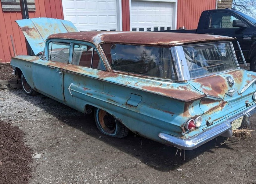 This is probably the rarest postwar full size Chevrolet body style ever made. In 1960 Chevy made almost 80,000 convertibles, but less than 15,000 Brookwood 2-door wagons. That production number was so low that GM stopped offering them the next year. FWIW, this car has only 3 options: V8, radio and heater. Because it’s a stripped down version of the big cars, there are no special trim pieces that will be hard to source, virtually everything needed to restore this car can be easily sourced from NOS and repro parts companies.