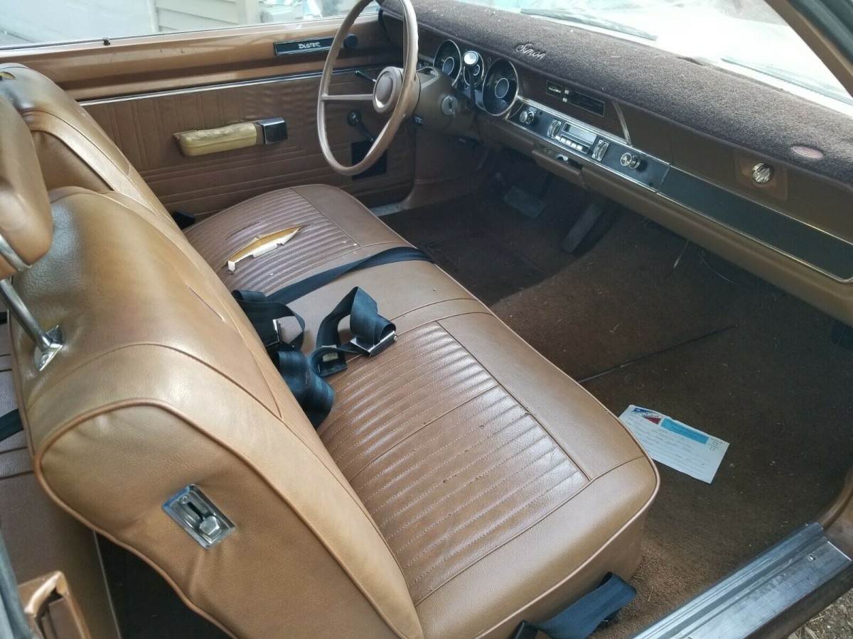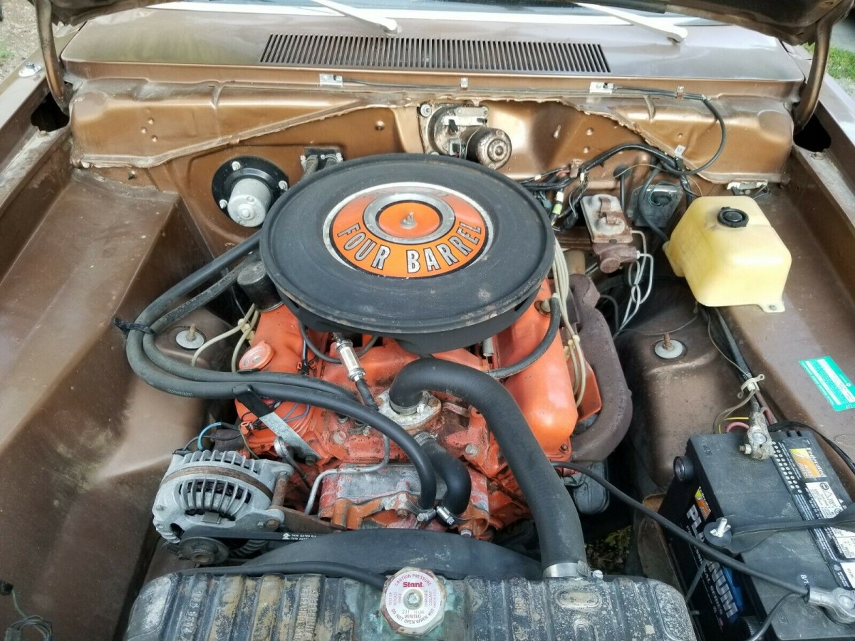 The original paint still looks pretty good, scratches and all. There is a small amount of rust beginning to develop at the bottom of the rear quarter panels and on one of the rockers. The white vinyl top, which is a nice contrast to the brown paint, looks to have held up well. The interior is also in good condition except for a worn spot that has turned into a tear on the bottom of the driver’s side of the bench seat. There is a cover over the dash, so we don’t know if that’s to hide a crack or prevent one. The odometer reflects 54,000 miles, which we assume is original mileage.