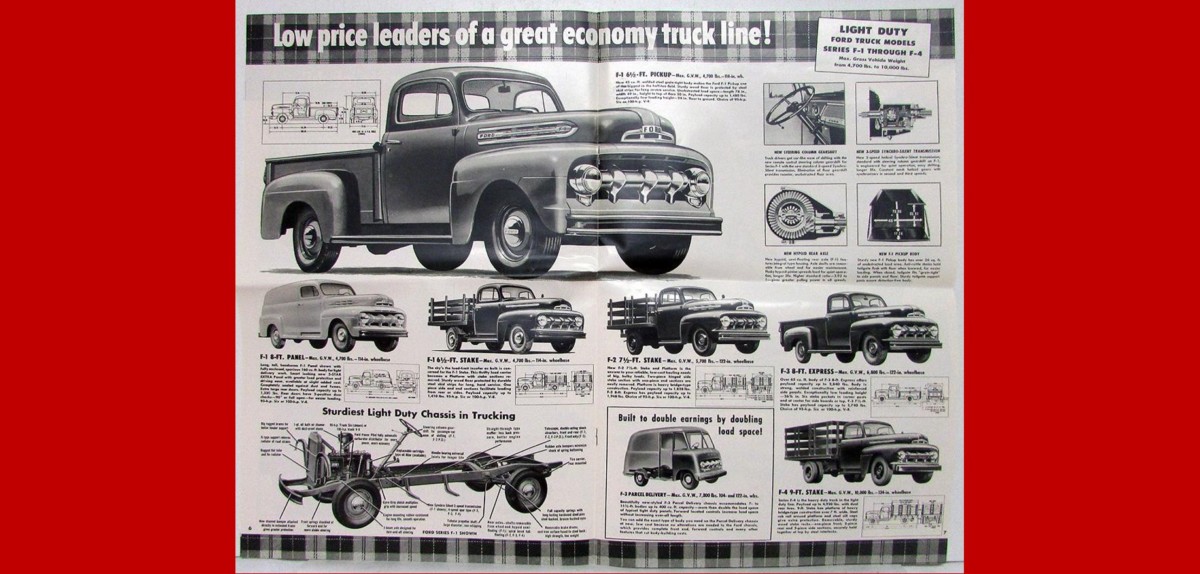 Ford introduced their first post-war-designed trucks in 1947 and they were quickly beloved by buyers. The F-1 was the 1/2-ton model and was the lightest-duty of them all. It still had a GVWR of 4,700 pounds and featured the “Sturdiest Light Duty Chassis in Trucking.”