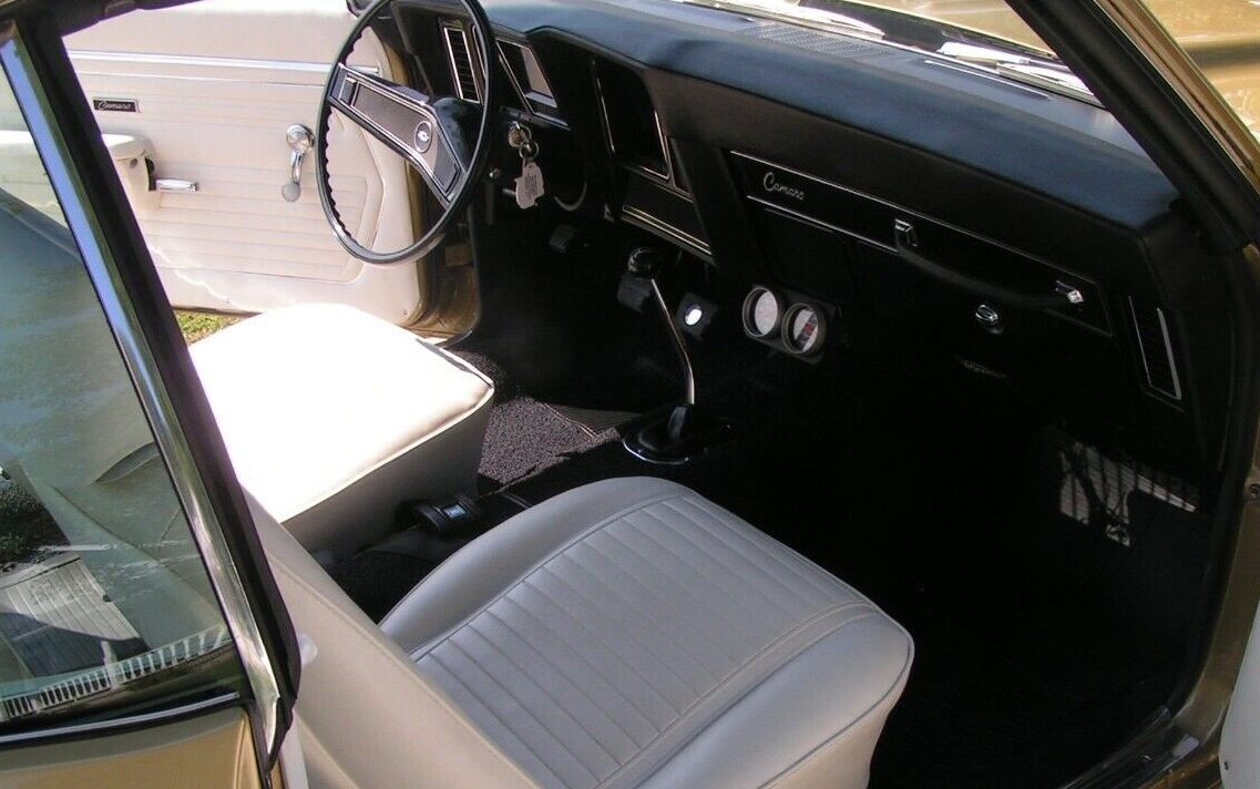 Gleaming Olympic Gold paint and the two-tone interior with white seats match this car’s original color scheme, according to the listing. The ’69 Camaro sits high on the list of many bow-tie enthusiasts, especially as the body stamping existed only one year before the all-new 1970 Camaro hit the streets.