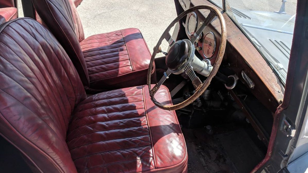 The interior is shockingly nice, with lovely red leather seats, handsome woodgrain dash, ornate gauges and a backseat that looks unused. The seats almost certainly had to have been redone in the past, making you wonder if this AC underwent a minor restoration at some point under the prior owner’s care. The foot pedals are my favorite part, emblazoned with the AC logo. The details are killer on this swoopy sedan, with a tool kit that looks like the car was built around it and other places where the AC logo is subtly woven in.