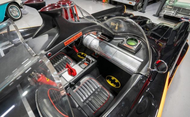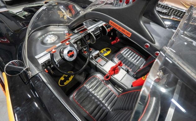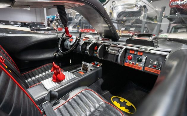 The interior is where this Batmobile shines, with the builder incorporating many of the elements that helped the TV original develop a cult following. The bucket seats feature wear-free Black vinyl covers with Red piping. The matching carpet is excellent, and the dashboard houses an Edsel dome speedometer. Of course, it wouldn’t be a Batmobile without the Batphone, the Emergency Bat Turn Lever, or the cut steering wheel with a bat in the center. Modern additions include a reversing camera, which would be worth its weight in gold given the car’s limited visibility.