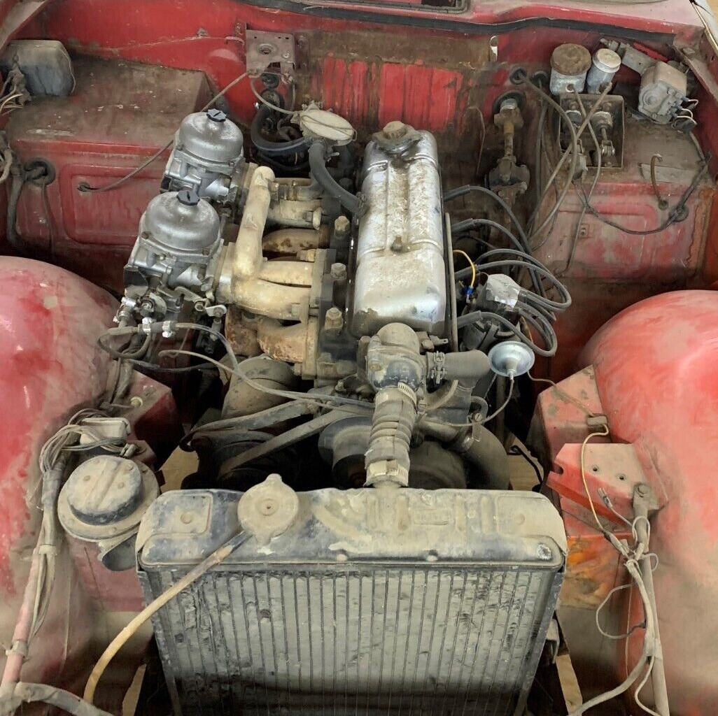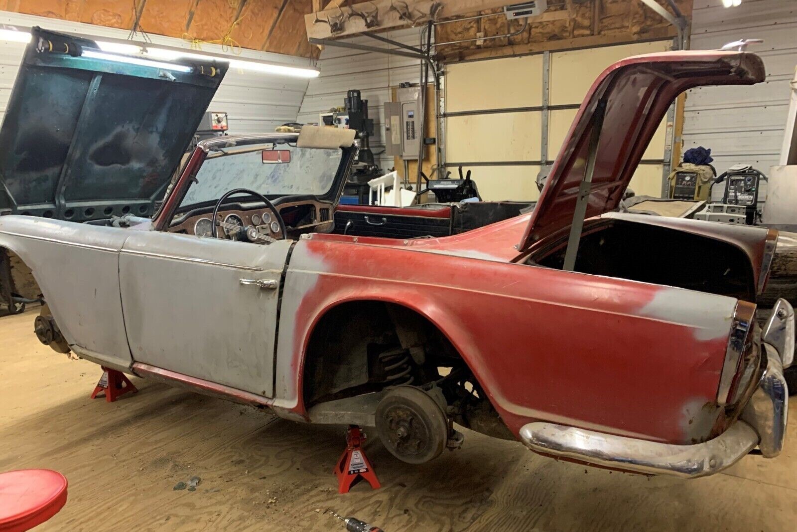 We get the impression the seller bought this TR4A in pretty much the same shape as it is today. The engine was free when it moved to his/her garage, but it’s stuck now, suggesting a long period of downtime. The twin carburetors were rebuilt by a prior owner and the car’s 4-speed manual transmission with overdrive is intact. It also has a full set of wheels that can go on to move it on and off the buyer’s trailer. The interior has only partially survived as the bucket seats are gone. The convertible top is there, but the fabric is toast and the hardware needs repair.