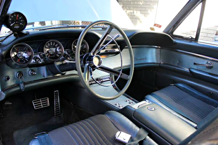 The last of this body style; a girlfriend of mine had one of these when I was in high school. Personally, the ’64-66 TBirds were my faves. I agree with Luke: the material on the seats are definitely not correct, as well as the pedal dress ups. And that tach….ewww . Nonetheless, a beautiful classic Thunderbird.