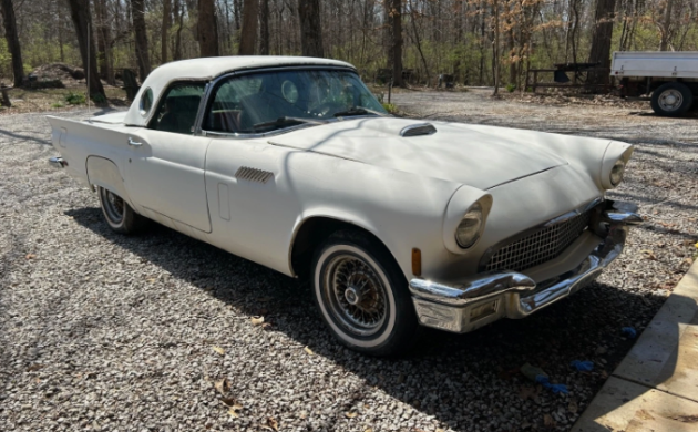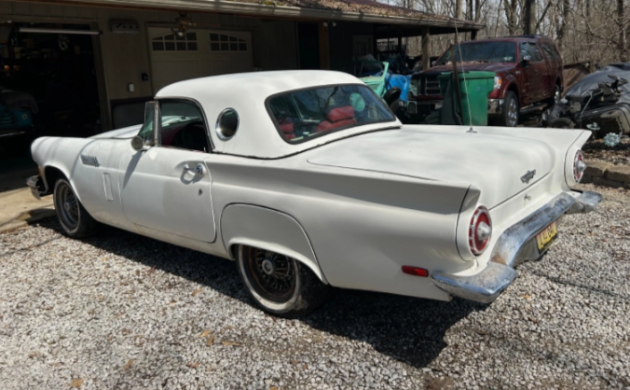 Who doesn’t remember the Beach Boys song lyrics, “fun, fun, fun ‘til daddy takes her T-bird away”? Or iconic scenes in the movie American Graffiti with Suzanne Somers driving her white Thunderbird? This white 1957 T-Bird replica brings both back to mind for me, and it’s a running (sort of) project in Marine, Illinois. It sports a more modern V8 but has been in storage for 20 years. This throwback ride is available here on eBay, where the bidding stands at $2,550, awaiting the reserve to be met.