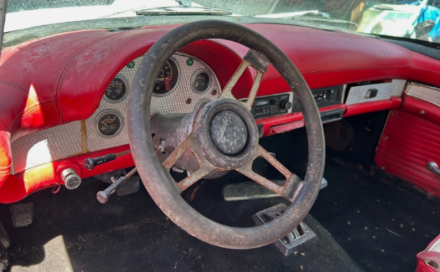 Ford built 21,380 Thunderbirds in 1957, as the run lasted into December thanks to delays in getting the 1958s ready. One of the complaints about the early T-Birds was about visibility, so with the optional hardtop, a porthole was added to each side in every case. As this replica was based on a 1984 car (Foxbody Mustang, perhaps?), it is said to only have 30,000 miles, maybe due to it being in storage since 2006 (more or less).