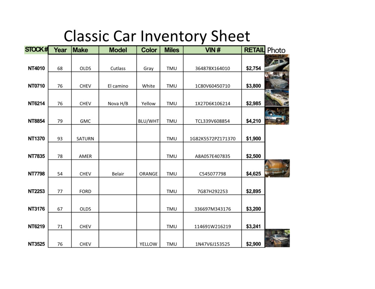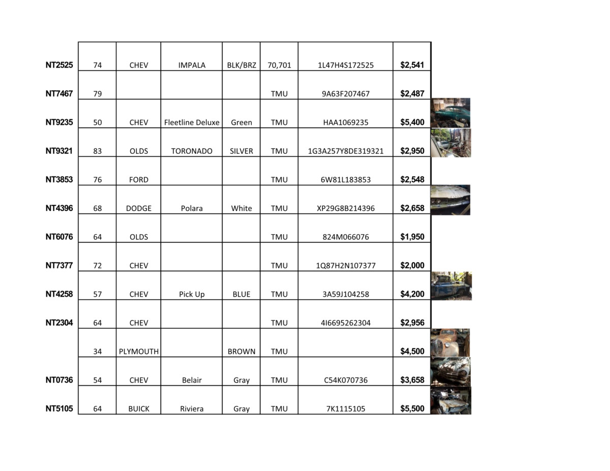 Thank you very much for that information. The cars have been stored in a garage that has been deteriorating for several years. My nonprofit organization that promotes crime prevention, has acquired the building and the cars. We want to get a decent price for the cars so that we can make repairs to the building. Here is a list of the inventory.