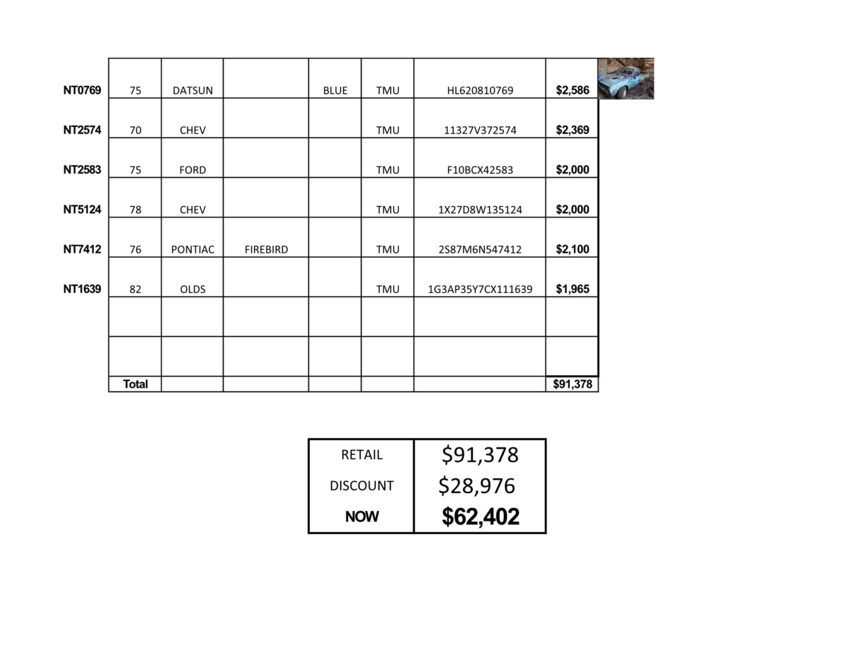 I think the price is like 62k for the cars?? But letâs be real here itâs a non profit local anti violence crime watch type that got the place donated to them ( itâs in the email I posted what the back story was) they probably have no clue looked on KBB or someplace got a value and stuck it next to the car. If you think 1 car is worth $1000 just for parts then offer it…if you think the whole lot is worth $30,000 then offer it.