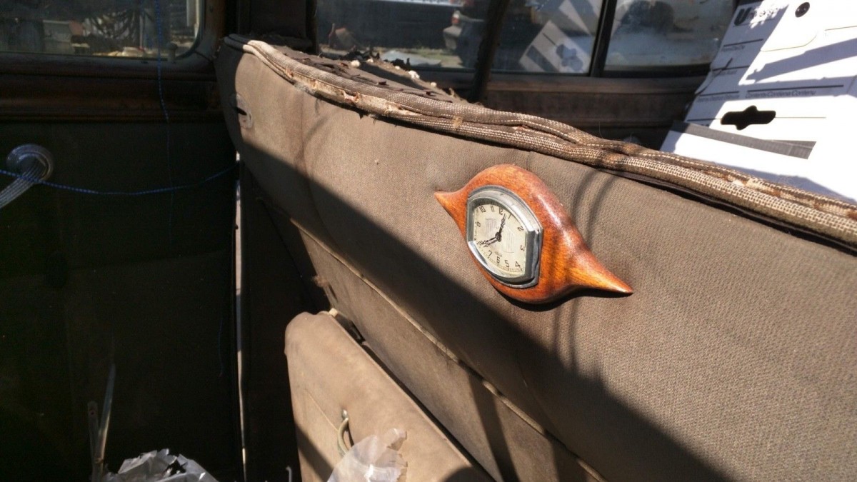 Even in the interior’s poor state, you can see in the photos that it was made up of quality components. The door fittings are very detailed with their fluted surfaces and wood good enough for high-end furniture caps the tops of the doors. This car has fabric on the seating surfaces both front and rear and most chauffeur driven cars had leather on the front seats, so this one may have been driven by its owner.