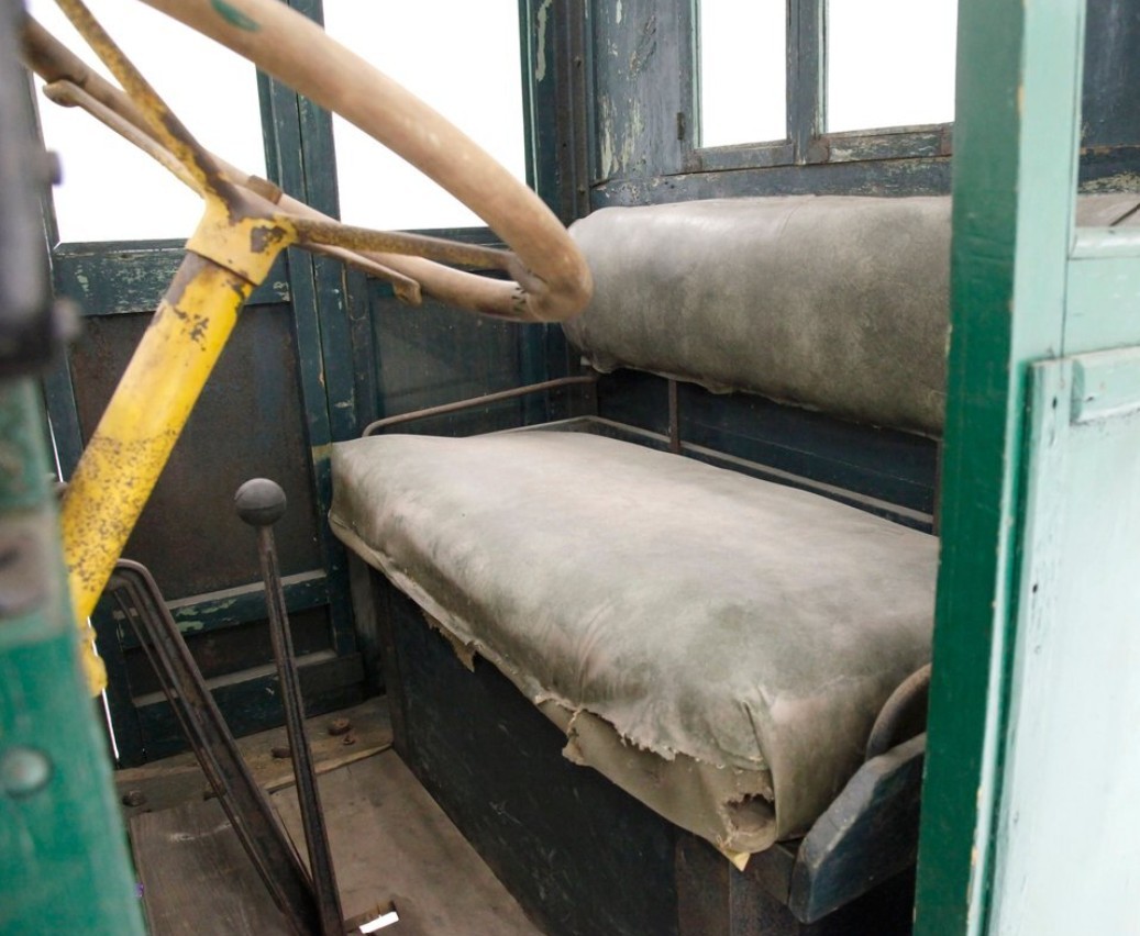 I love the “instrument panel” – that’s about as simple a gauge set as I’ve ever seen. But hey, we weren’t traveling much faster than a horse yet, so who cared. The rear windows resemble those in my garden shed. The remnant of an oil lamp hangs on the cowl. A leather bench seat, wood floorboards, and a gracefully curved roof round out the driver’s accommodations.