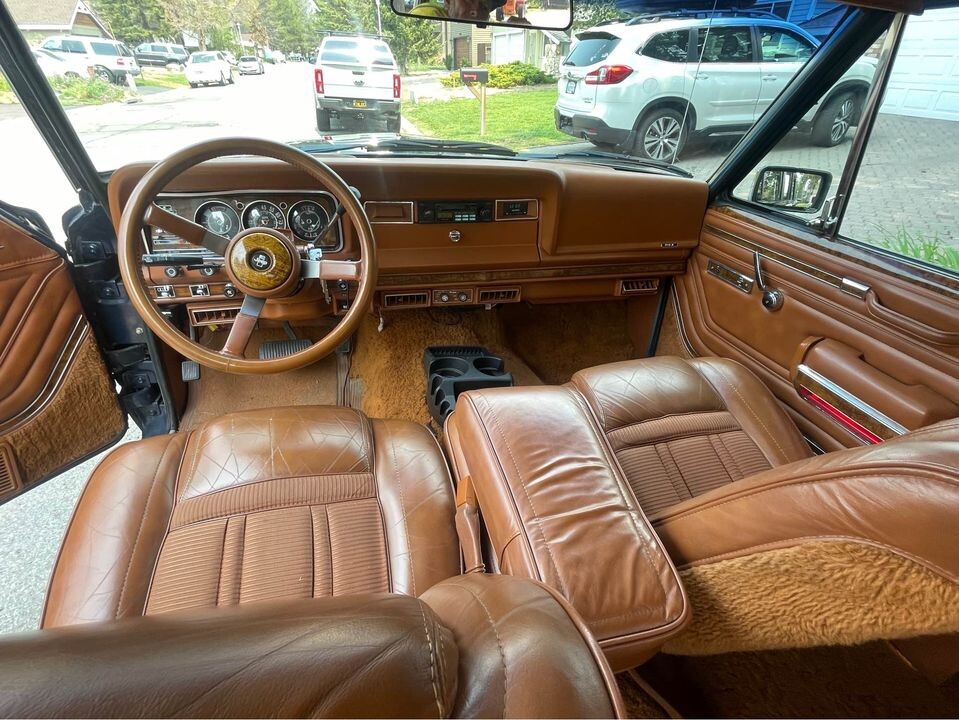 The seller doesn’t give us any background or history or if it’s been a California Jeep all its life. The seller states that it’s had two owners, it’s been driven 37,100 miles, it has had no significant damage or problems, and that it’s paid off. The seller then lists the “options” that are on the Grand Wagoneer although I suspect many were standard given the luxury nature of these vehicles. Rust can be an issue with Grand Wagoneers but I’m not spotting any, and the Deep Night Blue paint looks very presentable and compliments the faux wood paneling very well. (I read where blues, greens, and whites are the most sought-after Grand Wagoneer paint color by collectors.) The bright stuff, trim, glass, lenses, and 15″ aluminum alloy wheels all look good as well.
