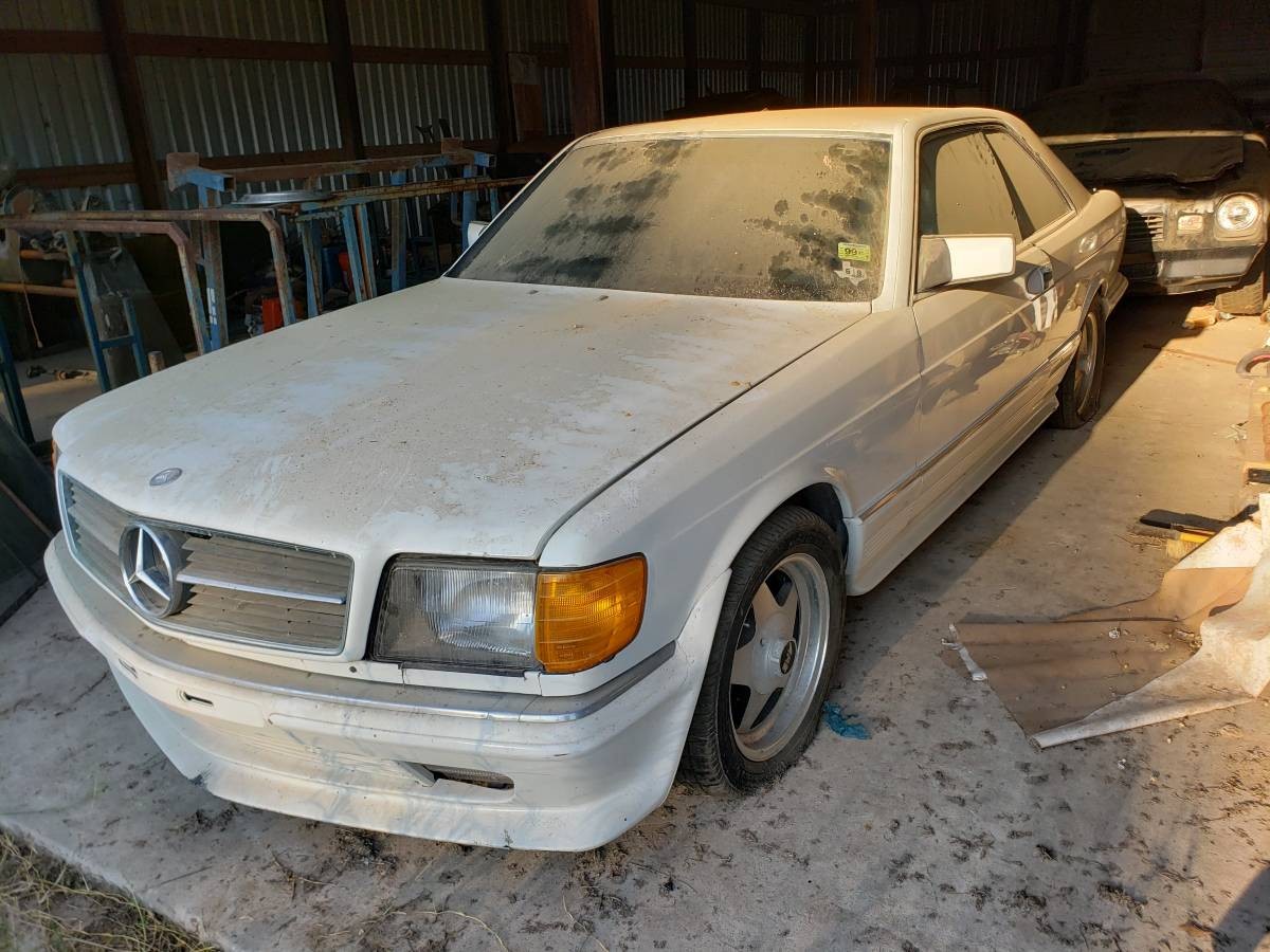 The Mercedes cleaned up nicely after leaving its barn confines, and the body kit thankfully appears intact with no signs of cracking or damage from contact with the ground. While the look went out of style in the 2000s, this five-spoke wheels are coming back – but I’d still rather see this 500SEC on period-correct BBS wheels. Note the European-market glass headlamps.
