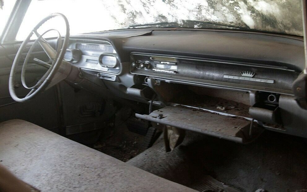 The interior doesn’t appear to be as destroyed as that of the ’62 convertible, it’s just incredibly dusty which makes one think that the windows were in the lowered position for some length of time. The dash pad is split and it looks like something may have been living in the glovebox. Interesting is to see that both of the lighters for the dual ashtrays (nothing like the ’60s!) have been pinched. From what can be seen of the bench seat bottom, it looks to be all together; maybe there is hope after all!