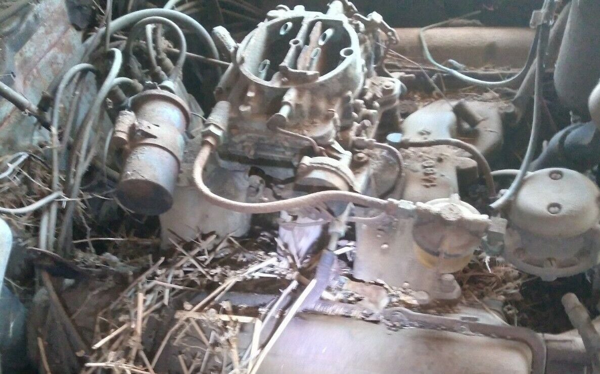 It is said that the 310 gross HP, 365 CI V8 engine, “does not run and the engine has not been turned over or touched“. What’s missing is for how long a time the engine has not been turned over. More than likely, it has been many moons since the Delco starter was engaged. The underhood shot is showing the full Green Acres treatment with what looks like hay scattered about so assume a major rebuild would be in order, if even doable. There’s no word as to what happened to the radiator but the air cleaner assembly is included, it’s just parked in the trunk. And fortunately, the seller has the trunk key as the ignition key is apparently lost. As with yesterday’s ’62 convertible, a Hydramatic automatic transmission was the only gearbox choice in ’58.