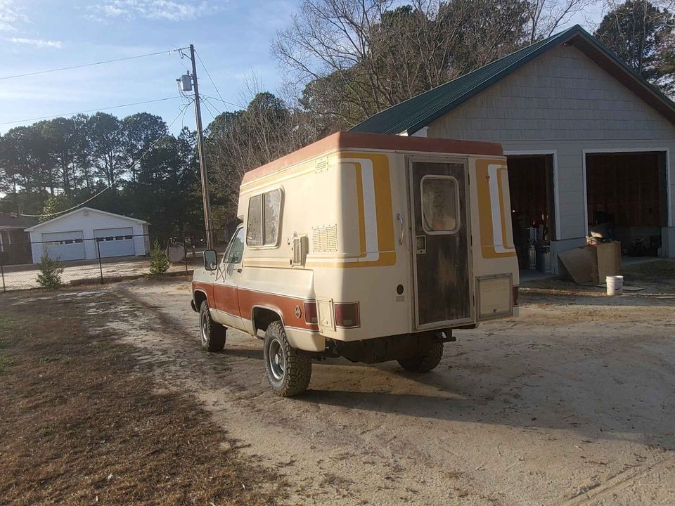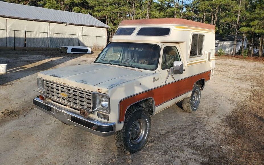 The camper body consisted of a fiberglass-reinforced plastic body over a steel frame, which was then mounted to the back of a Chevrolet Blazer or GMC Jimmy. The open space between the cockpit of the truck and the living space of the camper made the interior seem very spacious. Plus, the roof of the camper was outfitted with an expandable top that could accommodate someone up to 6-foot 5-inch tall. The camper portion of this example looks to be in good shape still, due largely to the plastic construction. You can see some rust starting on the cab of the truck though, which is very common with Chevy trucks from this era. Other than the hood, the paint looks good (although you can see the dreaded hood kink on the passenger side of the hook, courtesy of bound-up hinges and hood crumple zones).