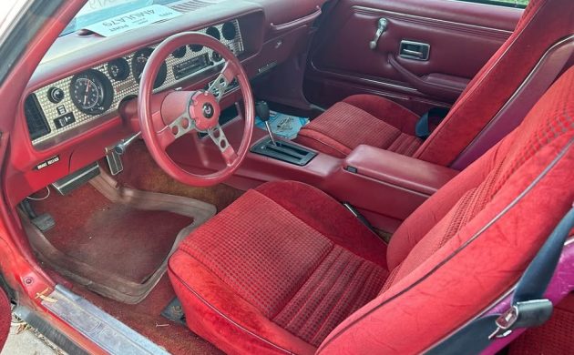 The red deluxe interior features hobnail cloth on the seats, which appear to be in fair condition with no visible rips or tears. In 1979, upgrading to the deluxe interior included upgraded seats and door panels. This vehicle does not have power windows but does have air conditioning. The cars does not have T-tops or tilt steering. The black seat belts appear to be incorrect or added later. From mid 1978, the seat belts and steering column were color coded. The seller provides additional pictures mostly of the exterior and some of the areas that need attention on this car.