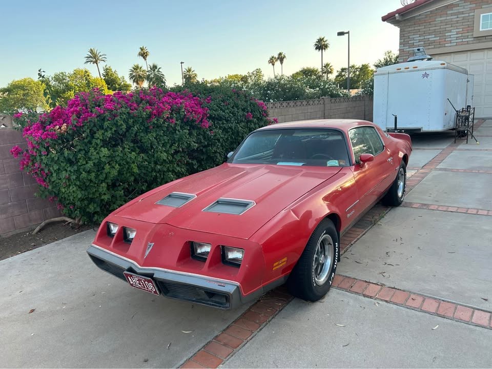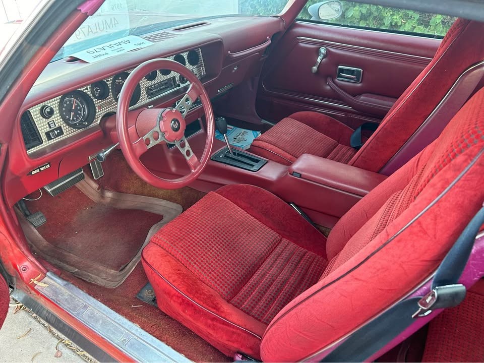 The red deluxe interior features hobnail cloth on the seats, which appear to be in fair condition with no visible rips or tears. In 1979, upgrading to the deluxe interior included upgraded seats and door panels. This vehicle does not have power windows but does have air conditioning. The cars does not have T-tops or tilt steering. The black seat belts appear to be incorrect or added later. From mid 1978, the seat belts and steering column were color coded. The seller provides additional pictures mostly of the exterior and some of the areas that need attention on this car.