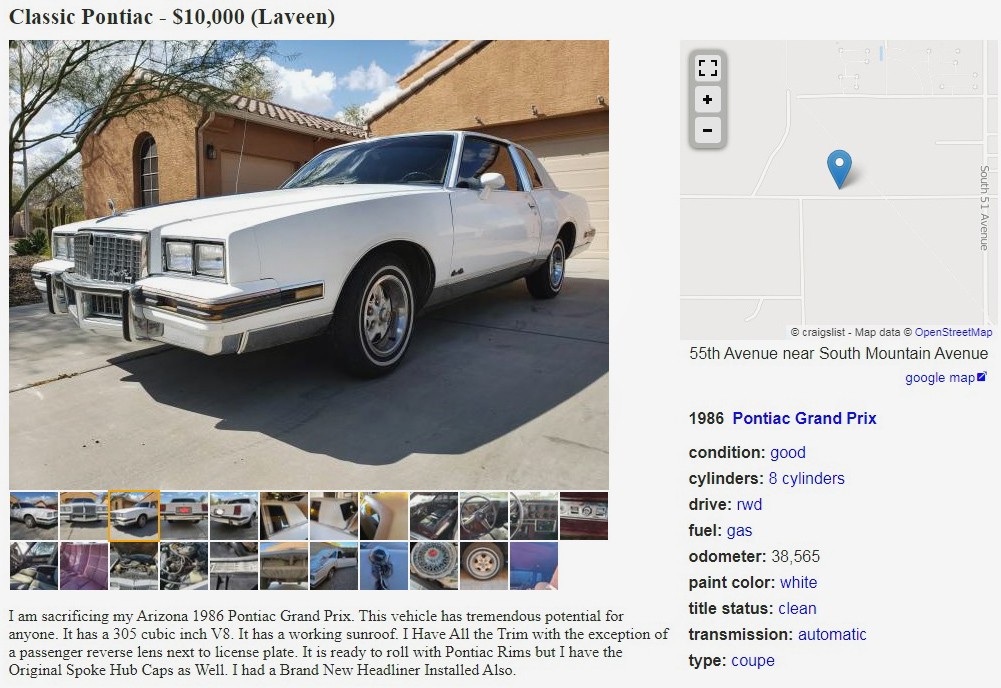 Coming in well over a foot shorter than the previous generation cars, the smaller fifth-generation Grand Prix still had enough interior room for most people and their passengers, despite the sheet metal being pared back a bit. The seller has this 1986 Pontiac Grand Prix posted here on craigslist in Laveen, Arizona, and they’re asking $10,000. Here is the original listing, and thanks to Rocco B. for the tip!