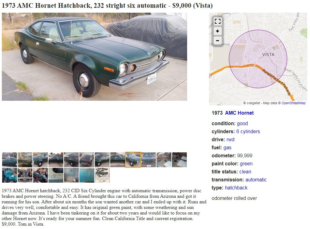 Most of us know that although a sunny and dry year-round climate can help preserve vehicles, as far as not being rusted out from road salt goes, it can also be harsh on paint and interiors due to that same sun and heat. This 1973 AMC Hornet Hatchback is posted here on craigslist in Vista, California, and they’re asking $9,000. Here is the original listing, and thanks to Tony P. for the tip!