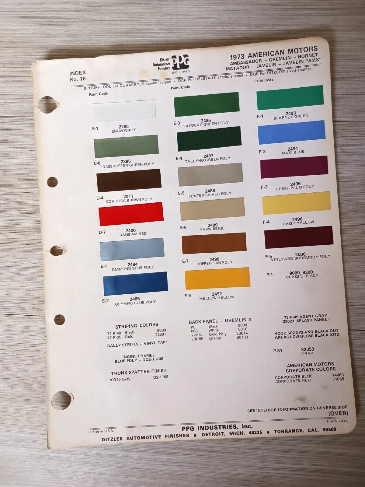 I can’t pin down this dark green color, at least according to two AMC brochures. Both of them are faded (page 20) when they show the colors, but I believe it’s either Tallyho Green or Fairway Green, according to this eBay paint chart. I’m leaning toward Fairway Green, and in either case, it looks nice on the sides, but the painted portion on the hatchback that isn’t covered with the rear window or part of the vinyl top (a very cool detail), the paint is mostly gone. Thanks, Arizona sun…