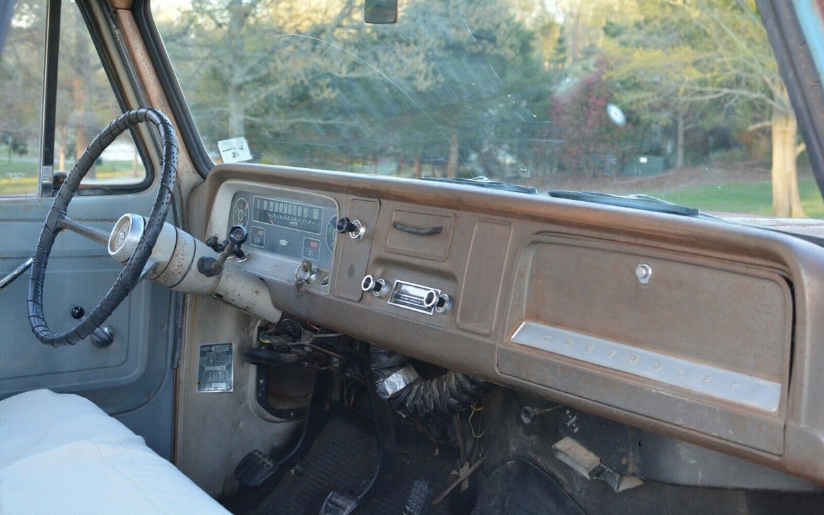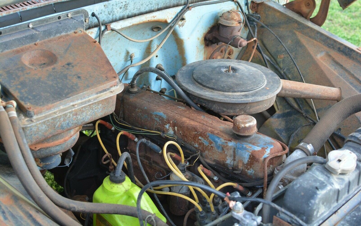 The interior looks pretty good to me, but there isn’t much padding here other than the seat which has a cover or blanket on it, so I’m guessing that has seen better days. It appears to have a 3-speed manual transmission with a column shifter and most parts would be available to restore this truck inside and out if the next owner wanted to do that. They’ll have to get it at a good price, though, as Hagerty lists a #4 fair condition value of $8,700 which is above the seller’s initial bid price. Maybe that’s why nobody has bid on it yet?