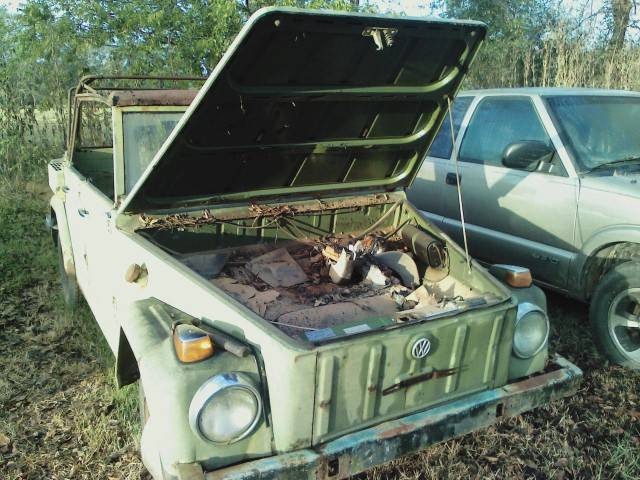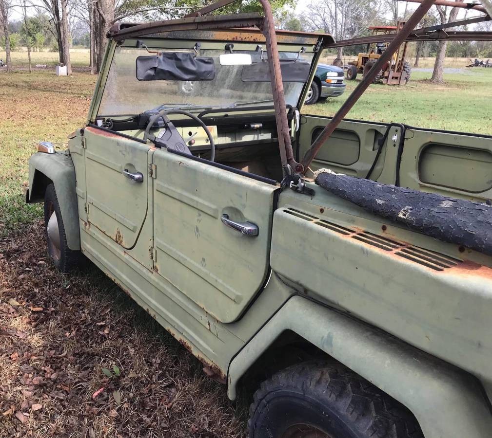 The Thing is listed for sale for $5,500 with the option to buy a parts rig for $1K. Located in Pensacola, Florida, the Thing would fit right in in a slightly seedy beach-front community. The seller says there is minimal rust and that the floors “…are thick sheetmetal” and could either be used or replaced. The soft top frame is still present, although the roof itself is long gone. No word on how long it’s been sitting exposed to the elements.