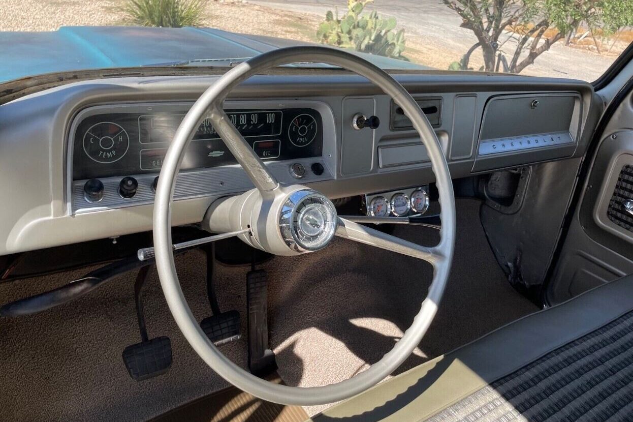 I have no doubt some readers will sigh with relief that I have avoided using the dreaded “p” word to describe this Pickup, although it may seem appropriate. However, since the appearance is deliberate, I have described it as “artificially aged.” The vehicle isn’t a genuine survivor, but its appearance results from clever painting techniques to capture that feel. The combination of Turquoise, Black, and White has been carefully combined to create the impression this C10 has earned its living down on the farm. The effect is dramatic, and the only signs of genuine aging are visible in the deteriorating bed timber, the original and faded bumper paint, and the rust hole in the lower passenger-side front fender. That appears to be the only rust issue, with the remaining steel appearing rock-solid. Fitting new bed timber would be a rewarding way to occupy a few hours during the colder months, and that seems to be the only cosmetic need. A competent person could fabricate the timber and strips themselves, although there is no shame in throwing caution to the wind and buying a pre-cut complete kit for around $650. The glass looks flawless, and the wheels wear shiny new hubcaps.