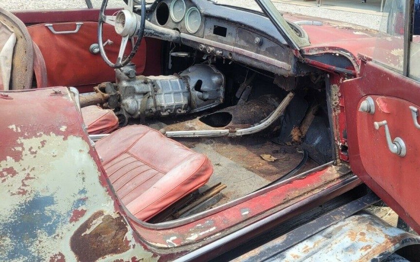 The 1.3 liter, DOHC, in-line, four-cylinder engine does not appear to have run in many moons and is revealing a goodly number of missing components. Being a single carburetor model, it’s probably a 74 HP variant employed between ’61 and ’64 but that is not known with certainty. The seller mentions that the engine turns over but he may mean literally as it’s “loose“, which sounds like it’s not attached to its mounts. The four-speed manual transmission is now resting in the passenger compartment.