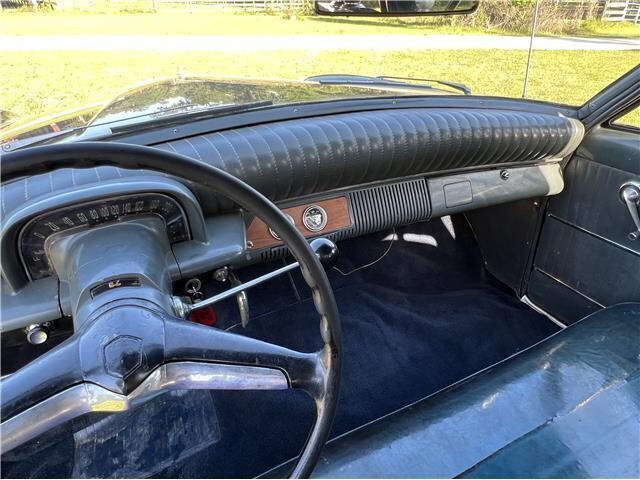 The blue and gray interior, like the rest of this vehicle, is interesting. Overall, it’s in good shape with a 50’s-era Jet Age instrument cluster (where the speedometer has been changed to kilometers) and an attractive ribbed padded dash. The bench seat looks like it has been covered in a clear plastic seat cover and there’s discoloration visible on the side. The current dark blue carpet needs to have some wrinkles stretched out and there are two aftermarket gauges where the radio used to be.
