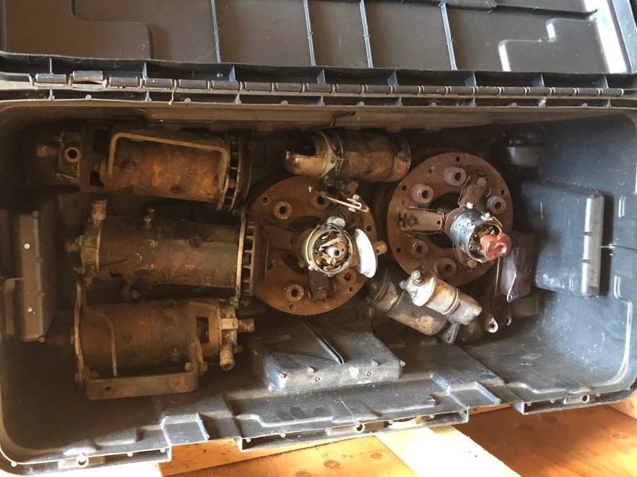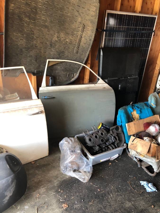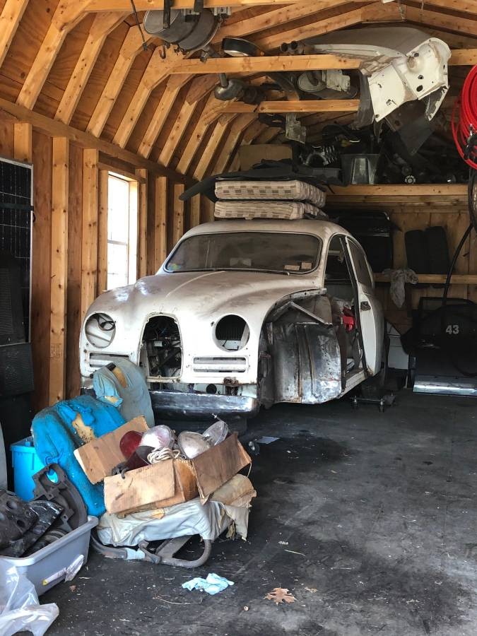 This project appears to have more than enough parts needed to at least assemble a complete 96. There are three transmissions, as well as boxes of parts that contain multiple flywheel/clutch assemblies, starters, distributors, and “waternators.” Yes, the bullnose 96 models had a “waternator” combination waterpump/generator assembly that was driven by the same belt which also drove the “overhead fan shaft” that cooled the radiator mounted behind the engine. The photos also show at least one disassembled 850 cc two-stroke engine in a box as well as another box full of headlights and taillights. The seller says that they have started sandblasting and powder coating the suspension parts and some of these can be seen in the photos too. The doors and fenders are present, though removed from the body. There is also a claim of a “new interior straight from Saab” which sounds interesting, to say the least.