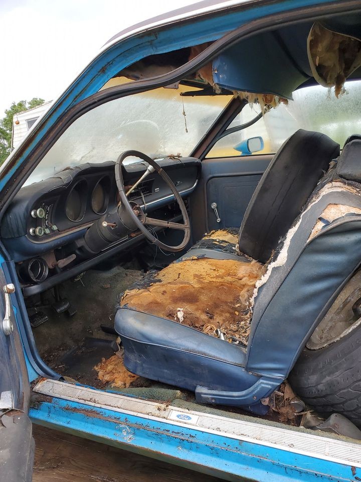 At a minimum, there is rust in the floorboards and probably in the trunk. We’re told the car is from Arizona and now in Alabama, but we don’t know how much time was spent where. Both the valances below the bumpers are bent up and the trunk lid may or may not close. The paint has a good chance of being Ford’s Grabber Blue original color, although Grabbers could be had in other colors. The interior is a disaster which means everything from the seats, floors, door panels, headliner and the rest will need to be refurbished.