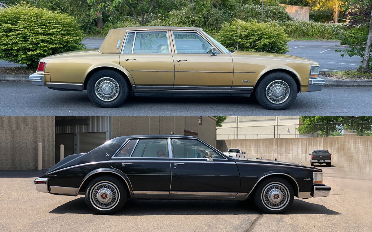 Some of you may remember that I recently had a very nice, one-owner 1984 Seville, and here’s a pic of both profiles. Yeah, there’s really no question which one I’d want out of those two, the gold one. Although my black Seville was an absolutely fantastic trouble-free car, I prefer the earlier Seville. My trunk was maybe a bit fancier than the trunk on the gold Seville seen here, although they’re similar. Yep, it’s the gold Seville for the win, hands down. I’d put nice white walls on the gold Seville if it were mine, even if black wall tires made it look more European and less posh, something that Cadillac was trying to accomplish. Or maybe not, I’m on the fence about that, what would you do: black wall tires or whitewall tires?