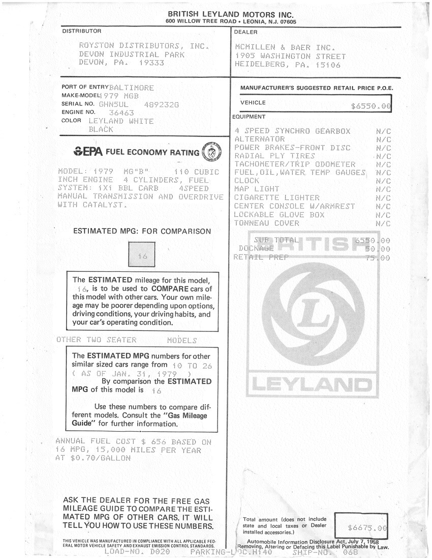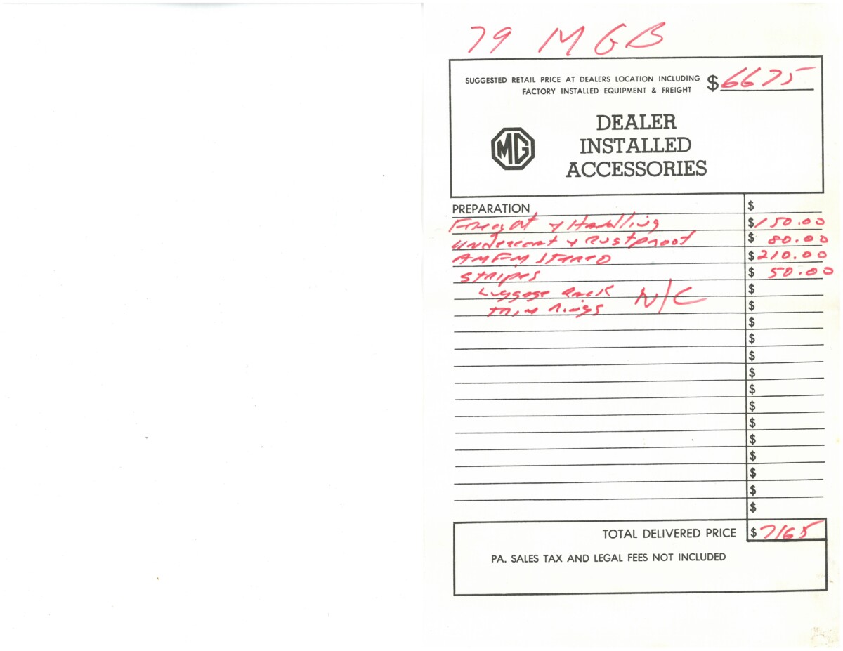 From Ben – I purchased the car in January 2022. The car was much as described but obviously undrivable and was very straight and correct with no hacked wiring and nothing missing. The engine turned by hand. After looking over the car negotiations lasted less than a minute with a discount on the price that made the car very well bought in my opinion but didn’t beat up the seller either. The MGB was snowbound in a garage on an unplowed back lane and remained so for about a month after purchase. The seller was a very nice fellow and allowed me to store the car for free as long as it was in my name and insured. A few interesting things about the ad and things found. The aftermarket radio appears to have been dealer-installed and more or less period correct. A Blaupunkt which would have been a higher-end unit at the time and still sounds good… I did receive both the window sticker and dealer accessory slip that shows the radio as added by the original MGB dealer. The owner was a car dealer so effectively I am the second owner of the car.
