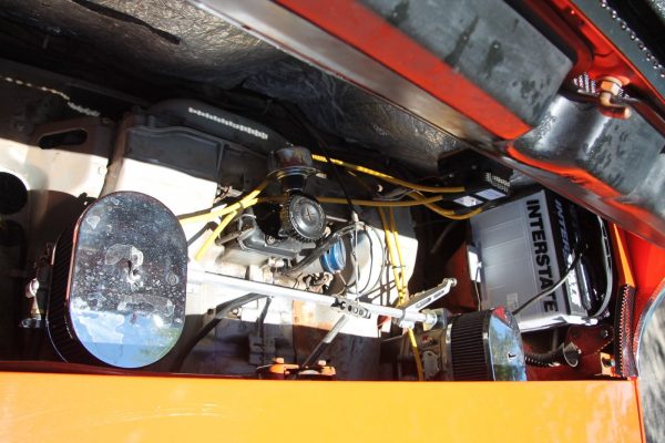This particular Porsche appears to be in good condition. The owner states that the car was originally equipped with the fuel injected 1.8 liter flat four, which my old Porsche was as well. A previous owner replaced the original with a 2.0 liter engine and dual Weber carburetors, which was a very popular upgrade. Inside the engine compartment, we see that everything is fairly clean and tidy. I am happy to see that the battery tray seems to be in good shape, as these were a real problem area for 914s. Often corrosion would eat away at the battery tray, causing the battery to fall into the engine while it was running and spill acid on the fuel lines. Catastrophic engine fires resulted, and this was a common reason for the early demise of many of these mid engine machines.