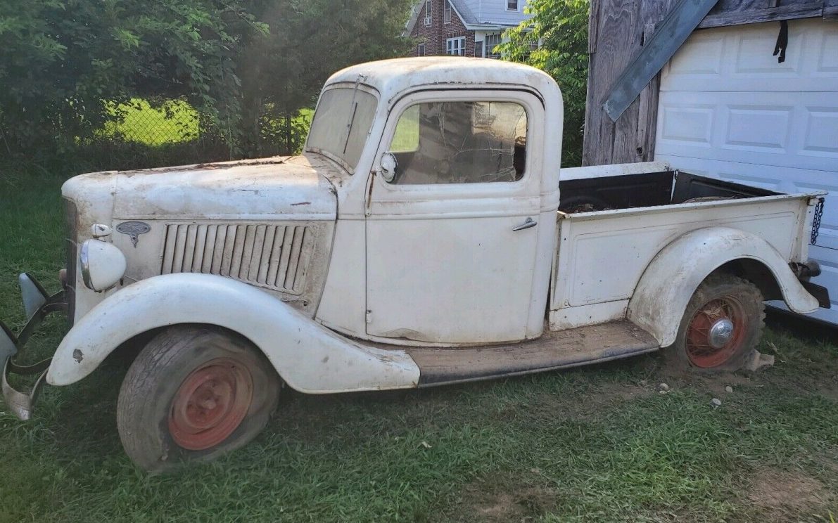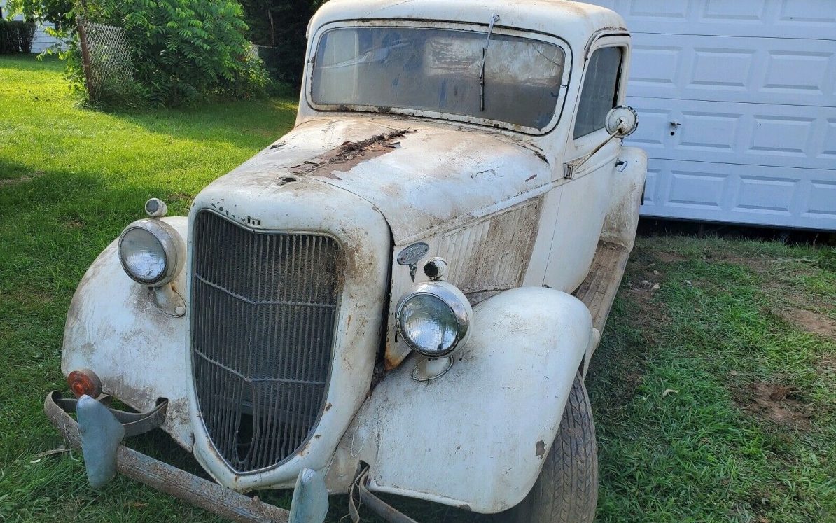 Right out of the gate, the seller states that this pickup is a 1935 model year but to my untrained eye, and the grille/hood vents, it looks more like a ’34 – any informed input on that front would be appreciated. Anyway, the visuals will have to the talkin’ as the item details are lax. The seller does state, however, “Grill and hood intact but missing support between grill and firewall. Grill and radiator missing mounting bolts“. The grille has either tangled or been tangled, with something that has put some spread into the lower center portion. It is hard to tell what’s up with the bumper as in is the chrome flaking off or is it silver paint that is peeling away? There is a lot of mold and surface rust but the body does not appear to have deteriorated. The seller mentions that other items are part of the sale, including wire wheels.