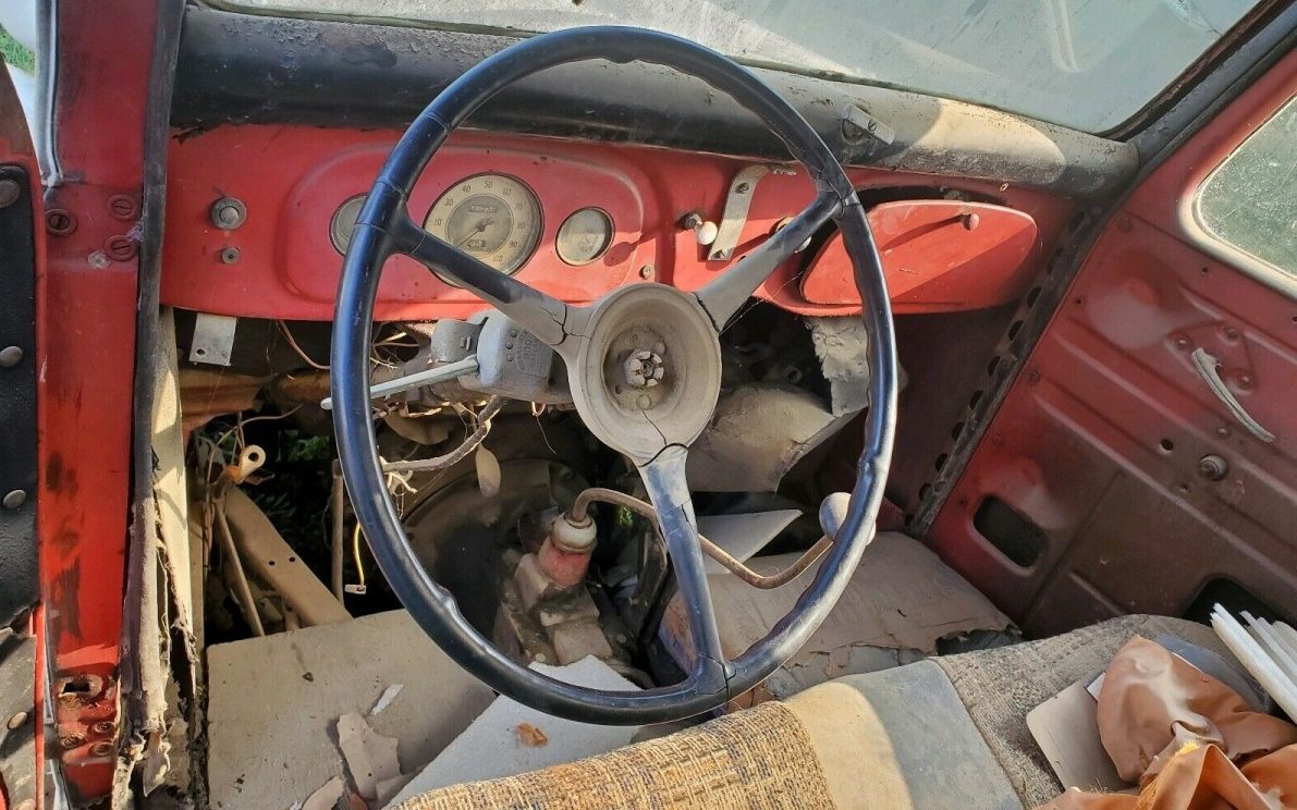 The interior, spartan as trucks of this era were, is notable for removed floorboards, dangling wires, a cracked steering wheel, dissolved door panels, and what looks like an auto parts store plaid seat cover pulled over the original bench. Typically, there is other stuff scattered about and obscuring the view but it probably doesn’t matter as there is nothing here to really see.