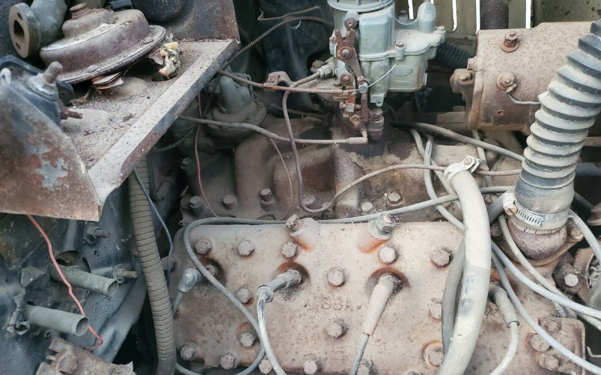 Power, when operable, comes from an 85 HP, 221 CI, flathead V8 engine working through a three-speed manual transmission. The engine appears to have not been touched in eons. Note that the distributor cap has been opened, and the radiator hoses are disconnected, perhaps an attempt to service or start? One should expect other foibles to appear as well.