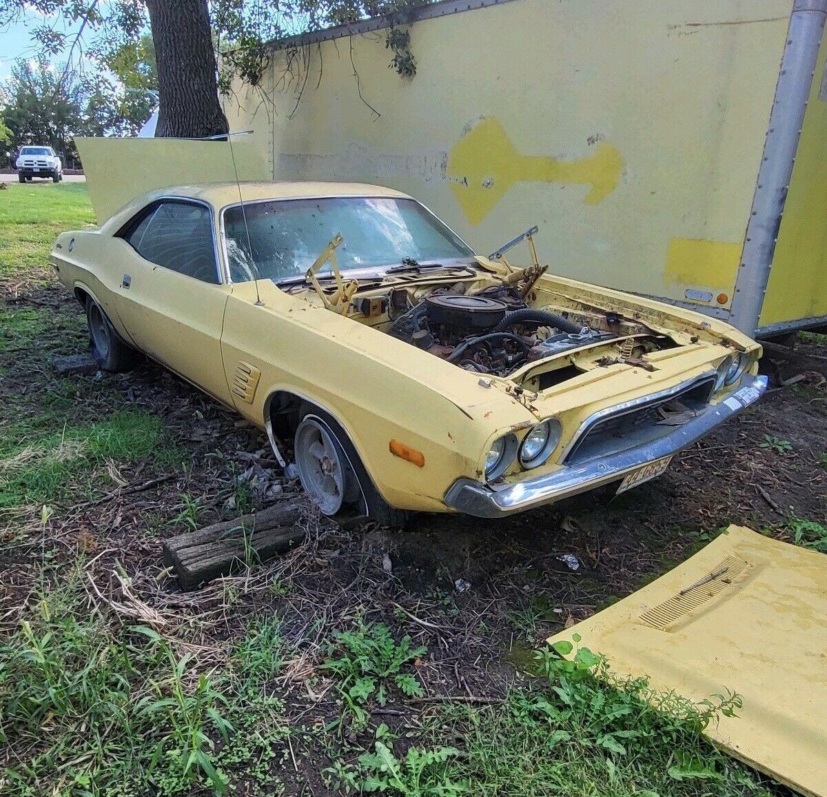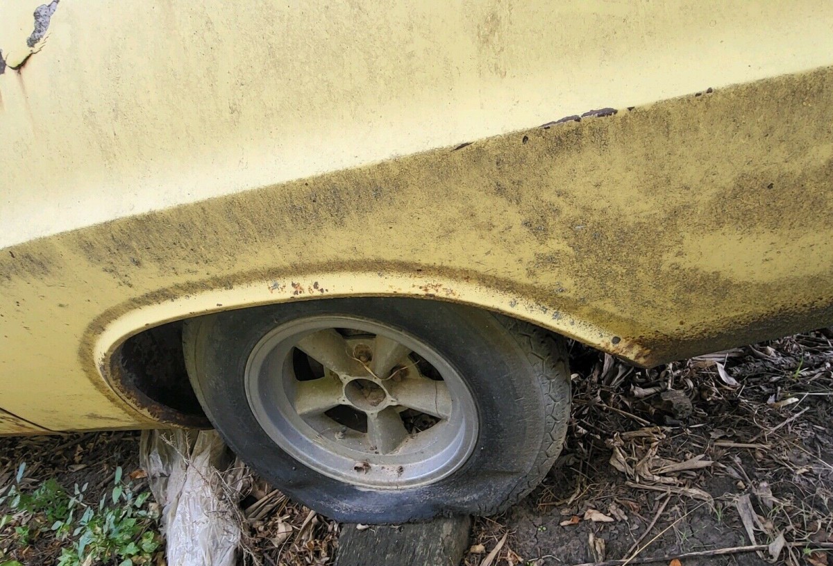 Standard in the 1974 Challenger Rallye was the basic 318 V8 (the 360 was extra). But you still got things like a performance hood, blacked-out grille, fake fender vents with strobe tape stripes, the Rallye instrument cluster, and the Rallye suspension. This description reflects the seller’s car, which appears to have been finished in KY5 Yellow Blaze paint when new. While we don’t know how long this car has been dormant, the seller says that documentation from its original owner has survived.