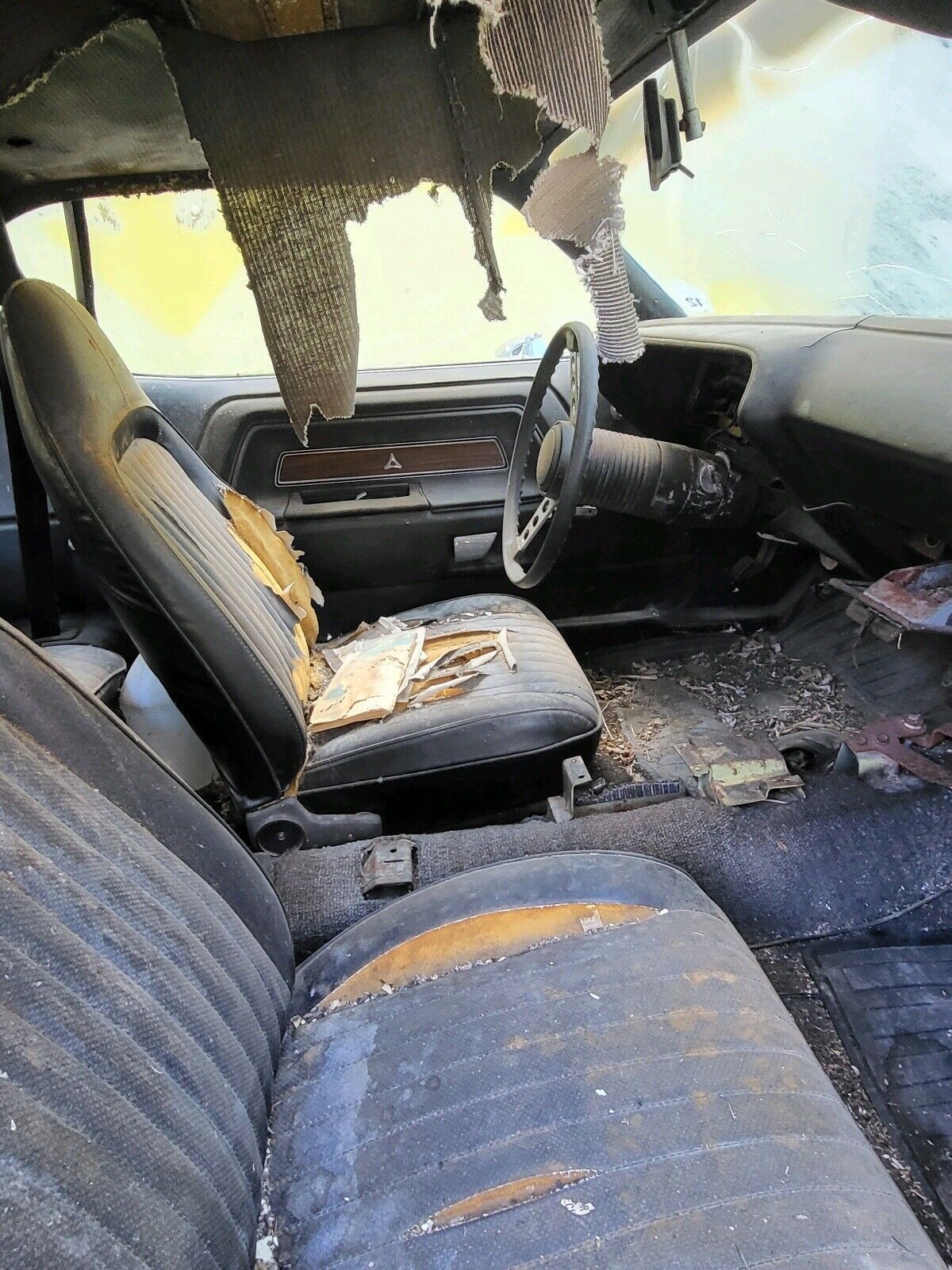 “Typical Midwest rust” is present, which is another way of saying it’s in the fenders, quarter panels, and trunk floor, though the passenger floors are said to be solid. The interior looks to be pretty well shot, with the seats and headliner in need of work and the shifter gone. On the plus side, even though this is a 318 with automatic transmission, we’re told the drivetrain is original to the Dodge. While the ’74 models were the least powerful of the Challengers, they were the last of the line which may make them a little more desirable.