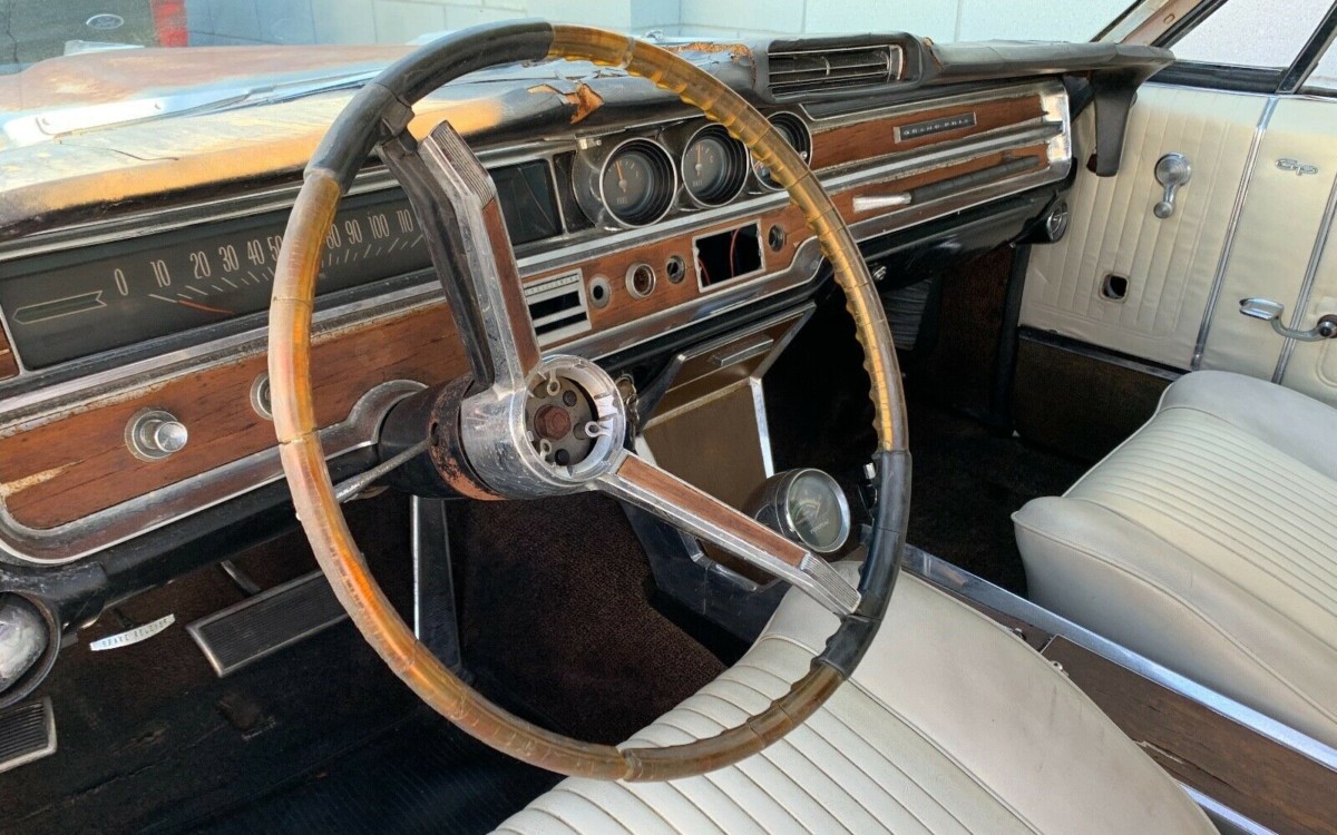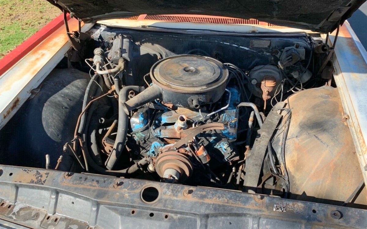 Here you can see the results of the last startup attempt. The radiator is long gone and the rest of the engine bay looks a little crusty. That’s the base 389 V8 in there, but it was still rated for 325 horsepower! There were even more powerful options available, but those numbers are nothing to scoff at. The fact that the seller doesn’t mention if the engine turns over freely or not might be though…