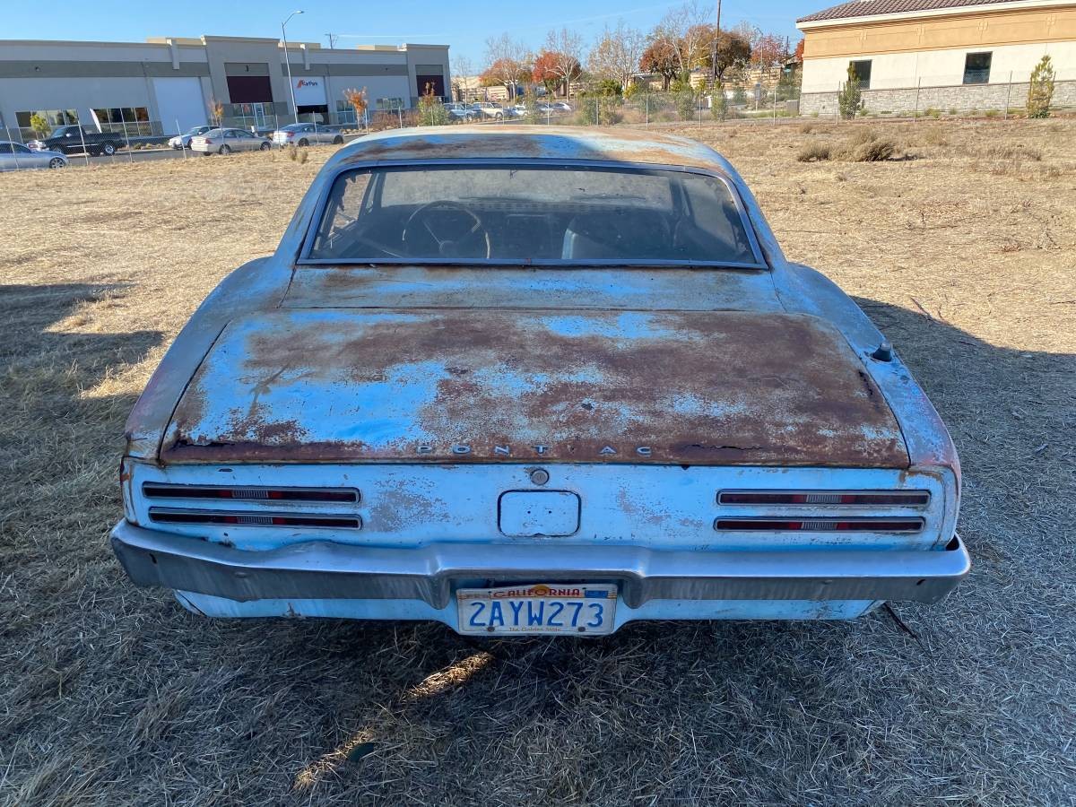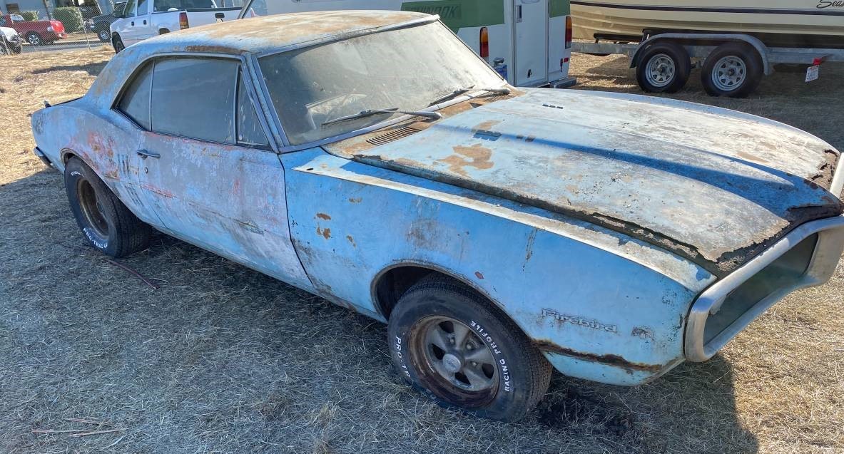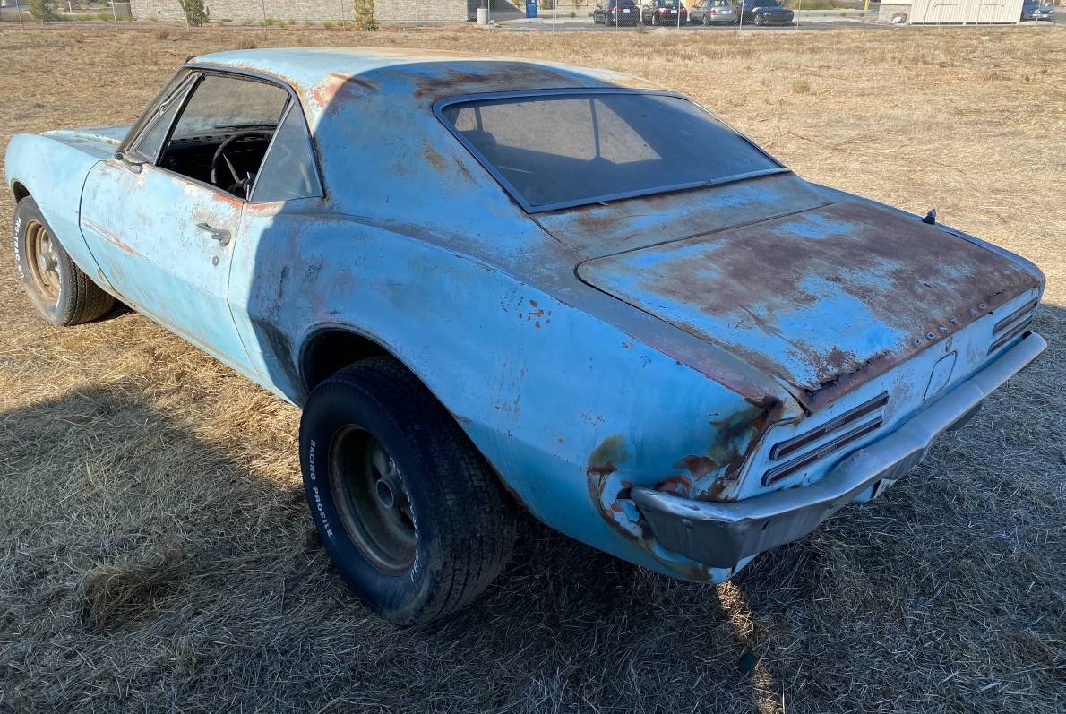 This seems like a rather ordinary-looking 1967 Firebird with aftermarket wheels that accumulated 70,000 miles before being left out in a field in the late 1980s. We’re thinking this car might have been finished in Gulf Turquoise Metallic back in the day, but by now it could be most any color, including primer grey. The hood and trunk lid both seem to have some rust where they close, and surface rust is mixed with some patina everywhere else. Also, the driver’s side has taken a small hit in the rear corner, so some straightening and a new bumper will be needed. The seats are said to be new, but I only see one bucket seat and who knows about the other.
