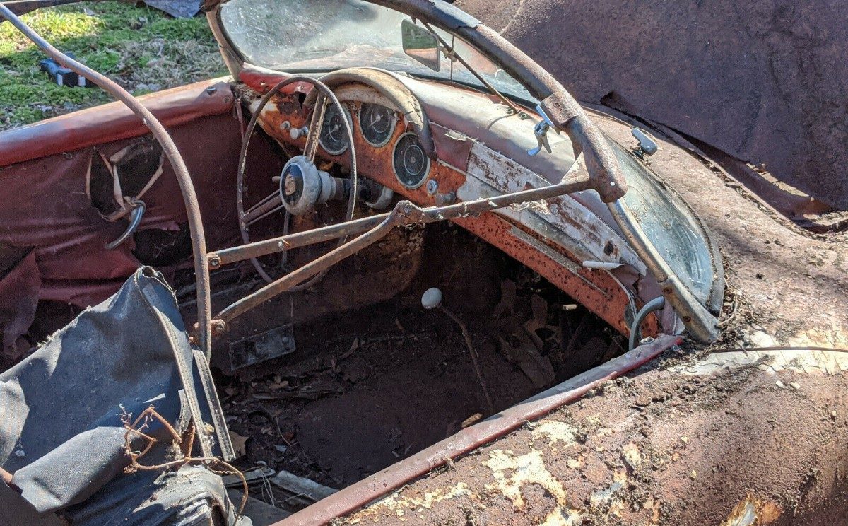 Whoever restores it will end up basically building a new shell out of new sheet metal parts. The suspension and mechanical parts can all probably be restored/rebuilt, and it look like even the side curtains are laying in the car. But what a disaster this thing is! Every moving part and every part that can be disassembled will be welded solid by rust. And that’s aside from whatever horrors were wreaked on it before it was parked there in the mud during the Reagan administration.