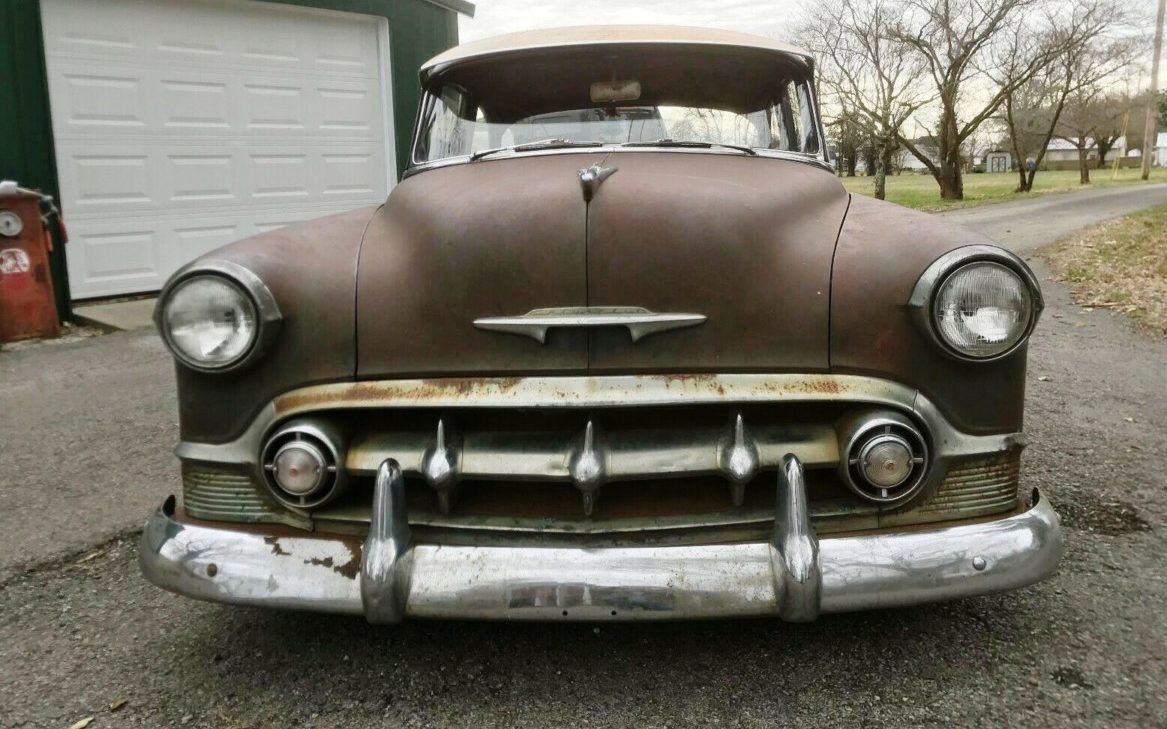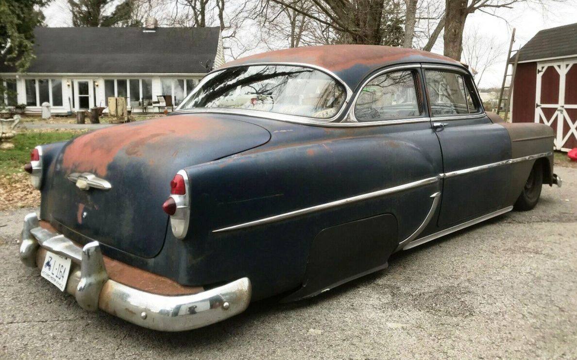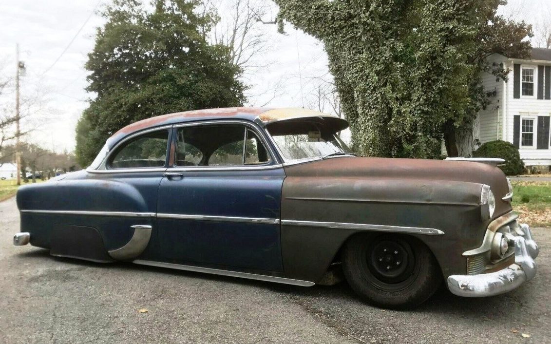 Built an Olds powered ’54. Similar to this car but in much better condition. No bags, just lowering blocks and cut coils. Always thought this series of cars were very good looking. A little paint and upholstery and you have something fun with this one.
