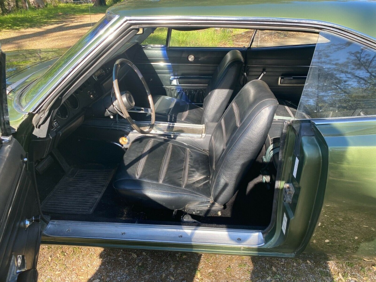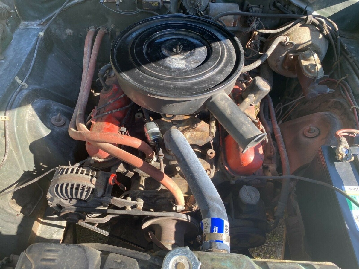 The dark green paint looks quite nice, the vinyl top it came with is gone and the roof has been repainted in a matching color. However, for a car that is generally rust-free, it seems that corrosion has targeted the trunk floor which might suggest there was rust under the vinyl and water leaked into the trunk, thus leading to the damage there now that should be corrected before getting worse. The interior generally looks good with a split in both the dash pad and steering wheel.