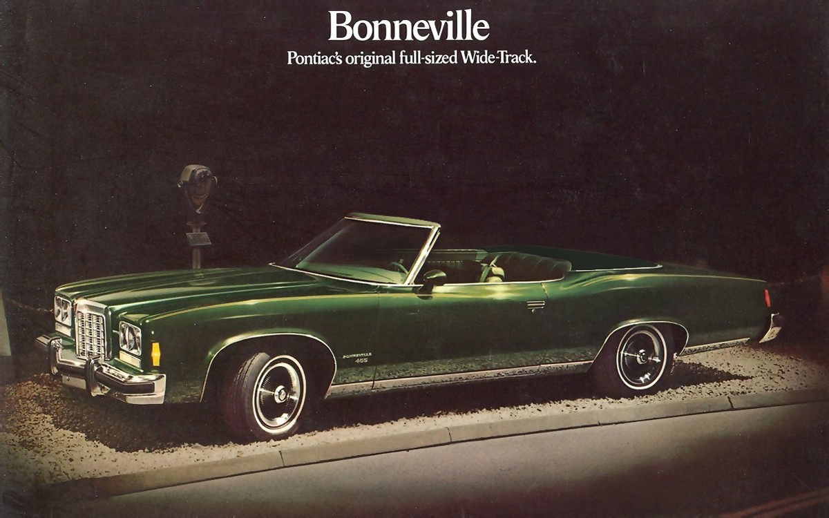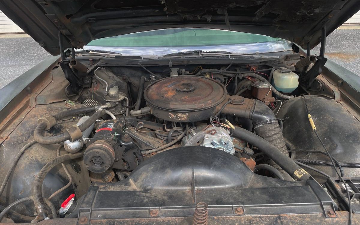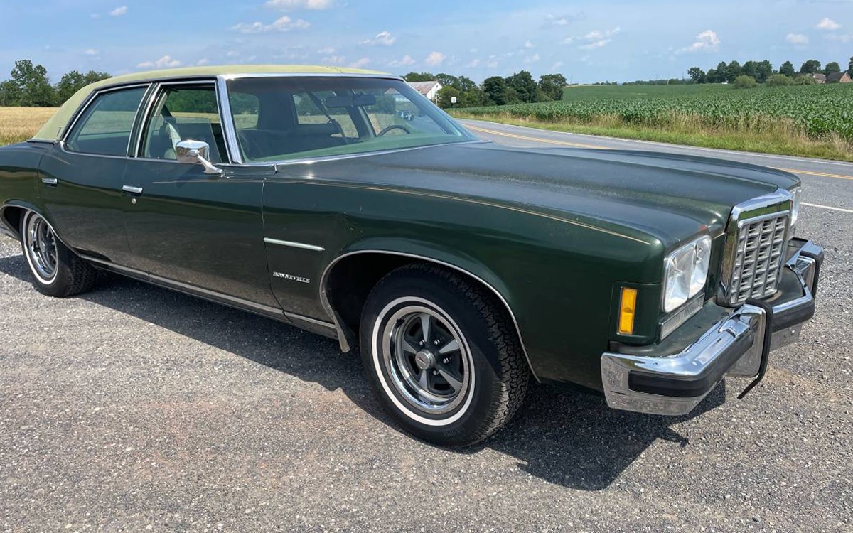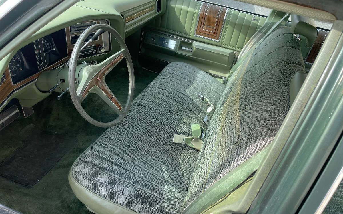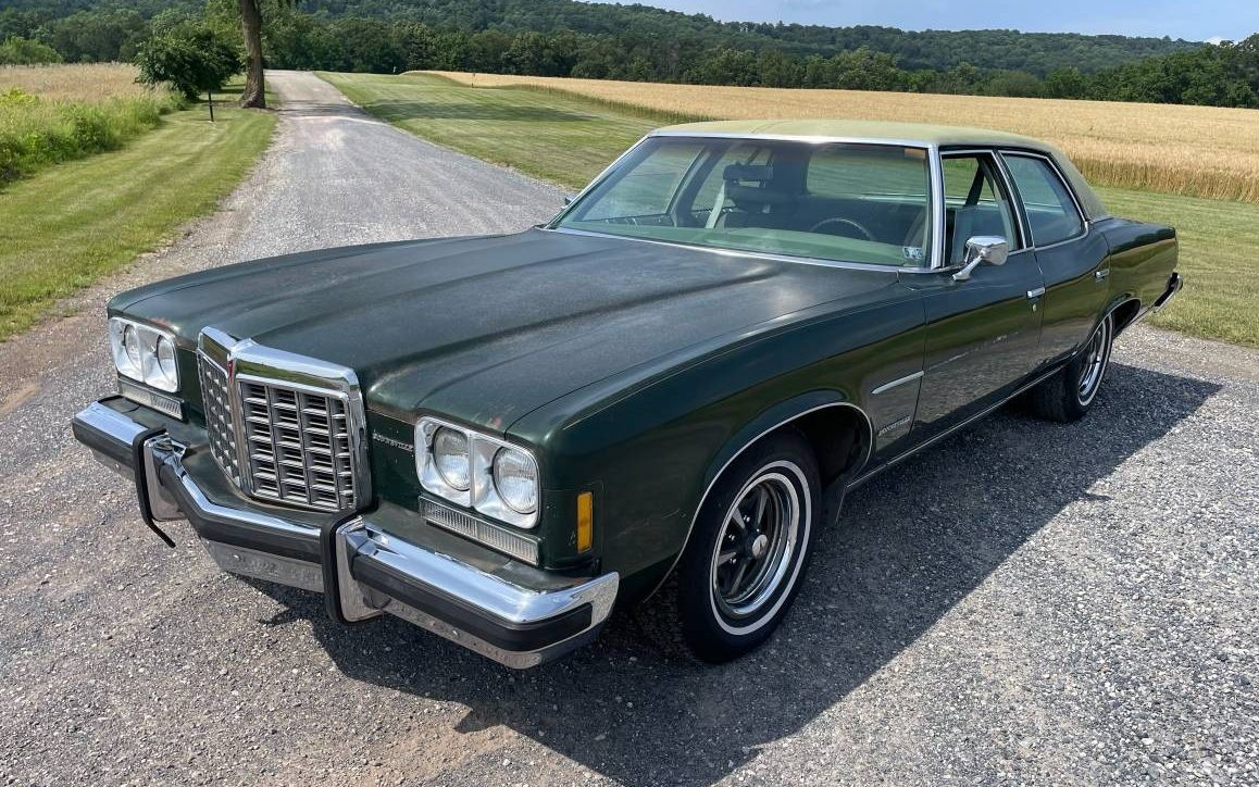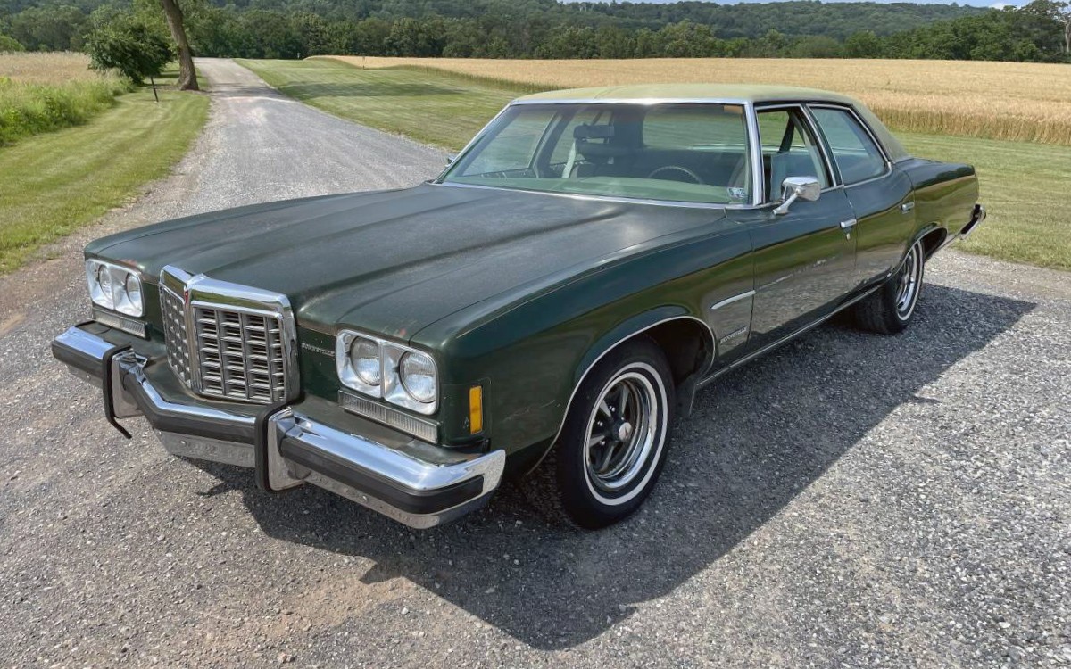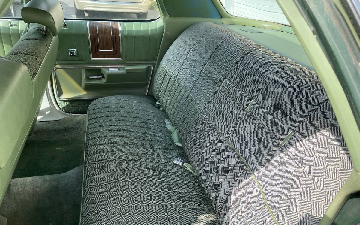 This brings back memories. My auntie gave us her 1974 Pontiac Bonneville with a 400 in it. It was green inside and out as well except she had hers repainted, and it was more of a metallic Jade green and did not have a vinyl top. She had the steel wheels with the hubcaps and that car eventually was given to me. Just out of high school I was happy to get any car and this car was a great cruiser. At the time my sister had a 1981 Trans Am that my brother managed to total, but I grabbed the hood scoop off of it before it got scrapped and grafted it onto this car and made it functional. My car only had the two barrel carburetor though, but it had some decent torque. This one with the four barrel carburetor must be even better! Although it wasn’t a super fast car I always used to try to street race people off the line at red lights. It would surprise a few people. Was built like a tank, pretty thick fenders. Someone had sideswiped our car and I tried to pound out the dent from the trunk and it wouldn’t budge. Very different than the metal that’s used on cars now.